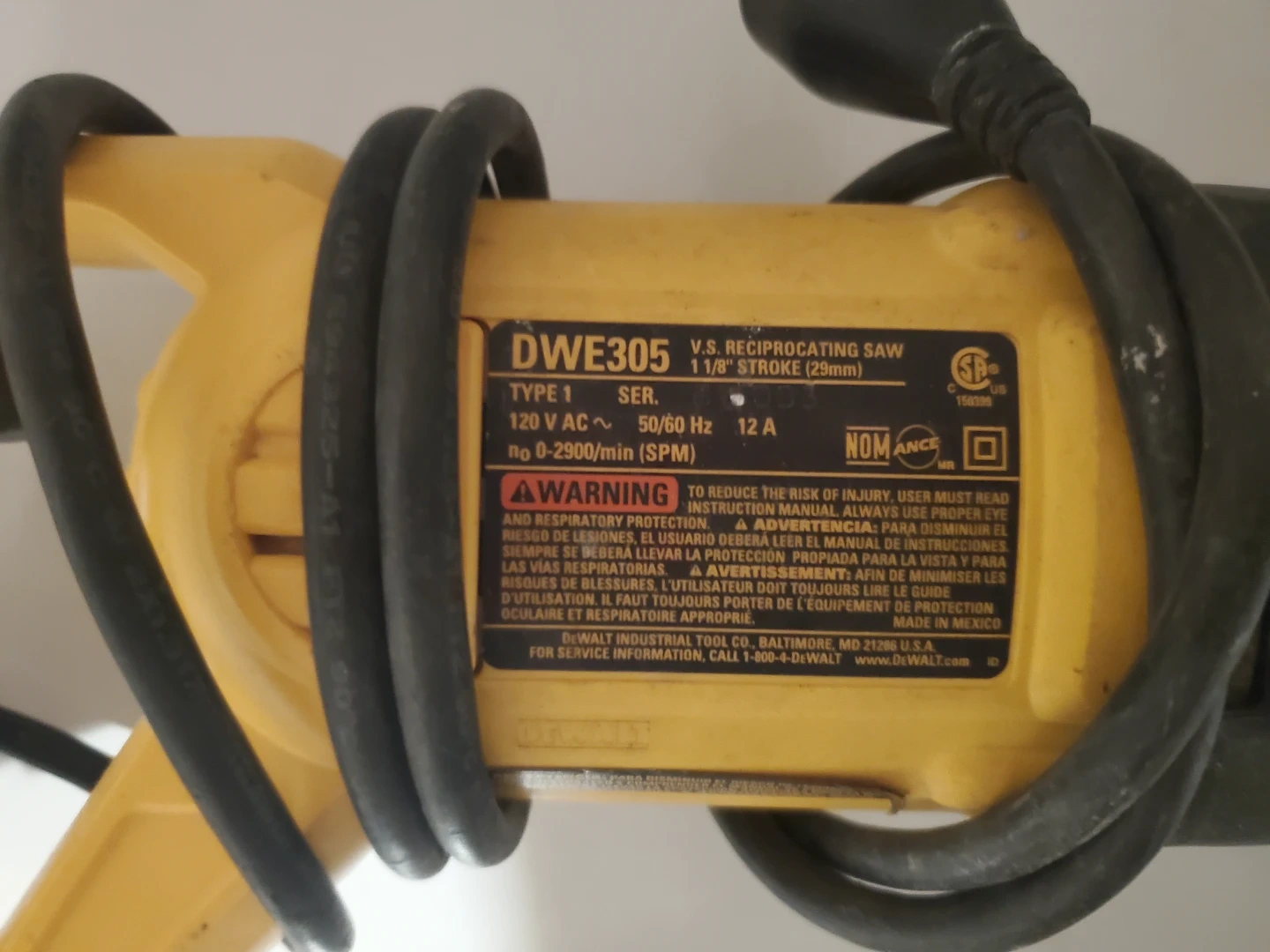 This is a DEWALT DWE305 reciprocating saw. It's a Type 1 model with a 1 1/8" stroke. Operates on 120 V AC at 50/60 Hz.