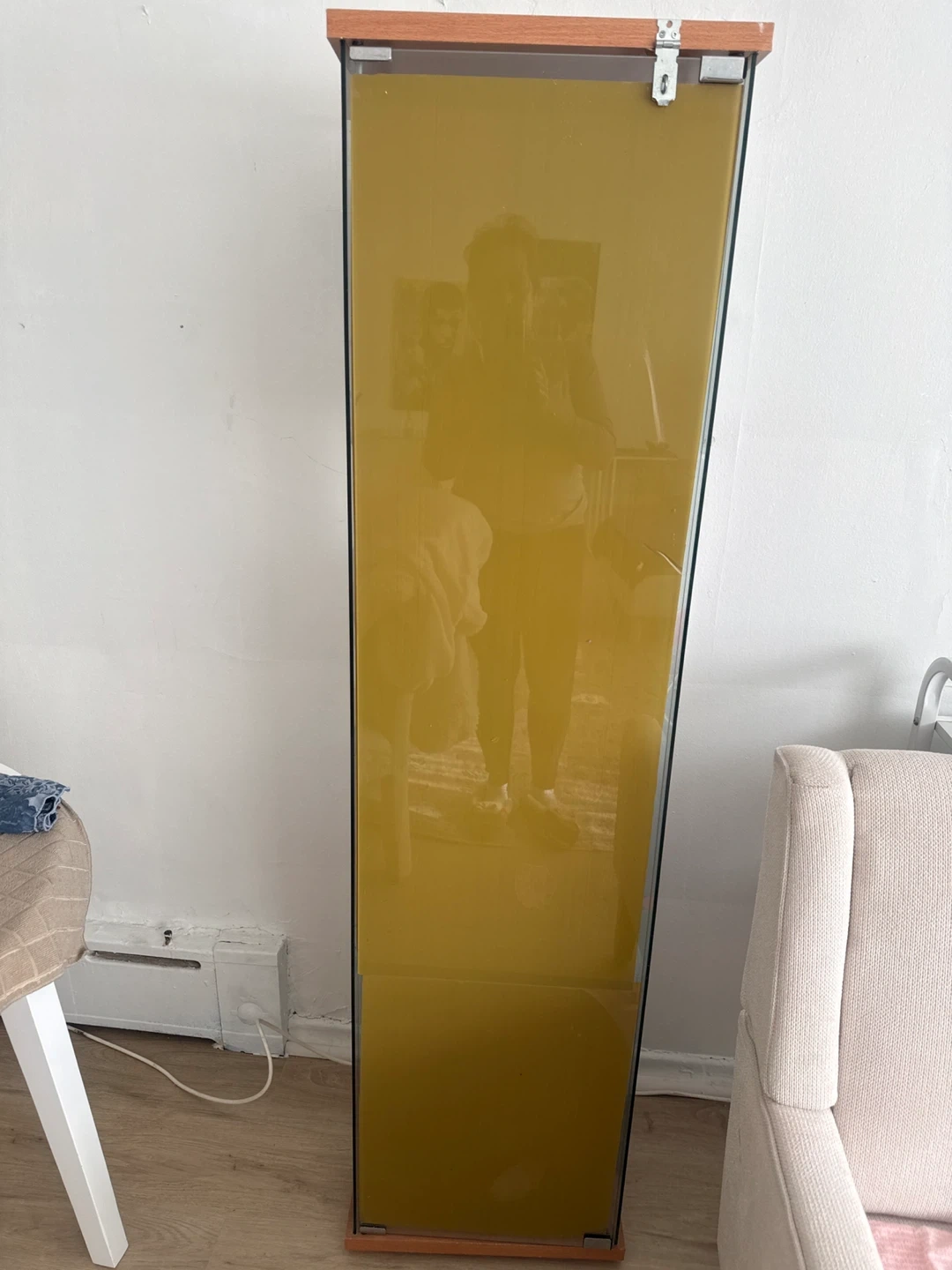 This is a tall display cabinet with glass shelves and a wood-trimmed frame. It has a single glass door with a latch. It's perfect for showcasing collectibles or small items!