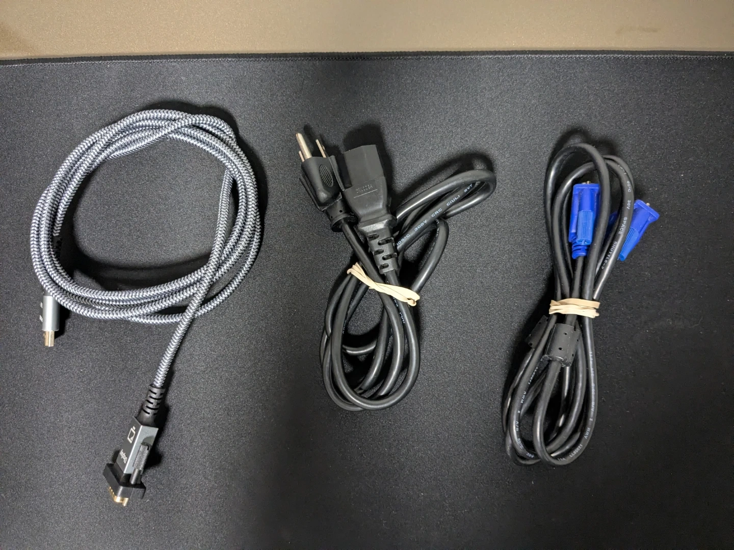 Comes with 3 cables: power cable, VGA to VGA, and VGA to HDMI. The monitor has VGA and DVI inputs.