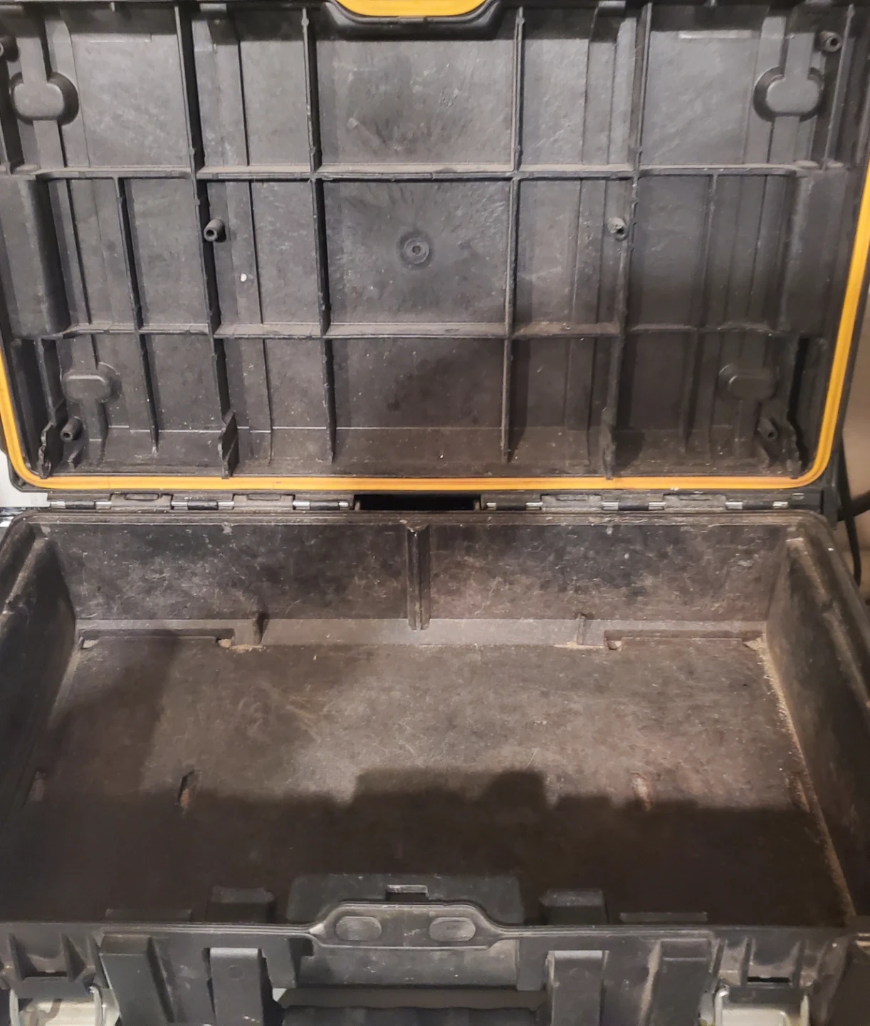 Heavy duty DEWALT tool case. Black exterior with yellow accents and latches. Interior compartment is open with molded sections on the lid. Case is dusty but structurally sound. Measures approximately 22 inches long, 13 inches wide, and 7 inches tall.