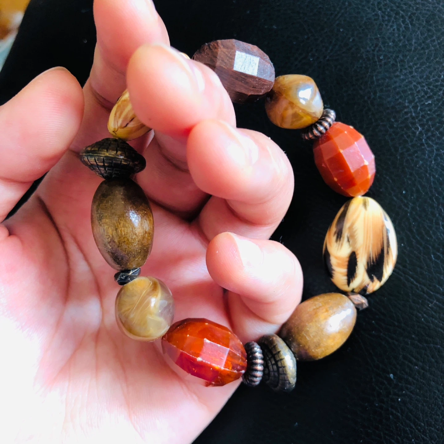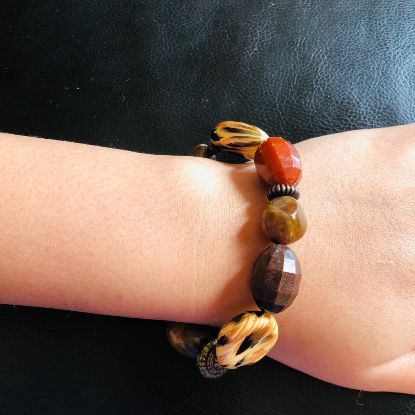 This stretch bracelet features a variety of natural-looking beads in earthy tones and warm reds. It includes smooth, faceted, and patterned beads for a unique look. Its elastic design makes it easy to slip on and off. Great for adding a touch of boho flair to any outfit!