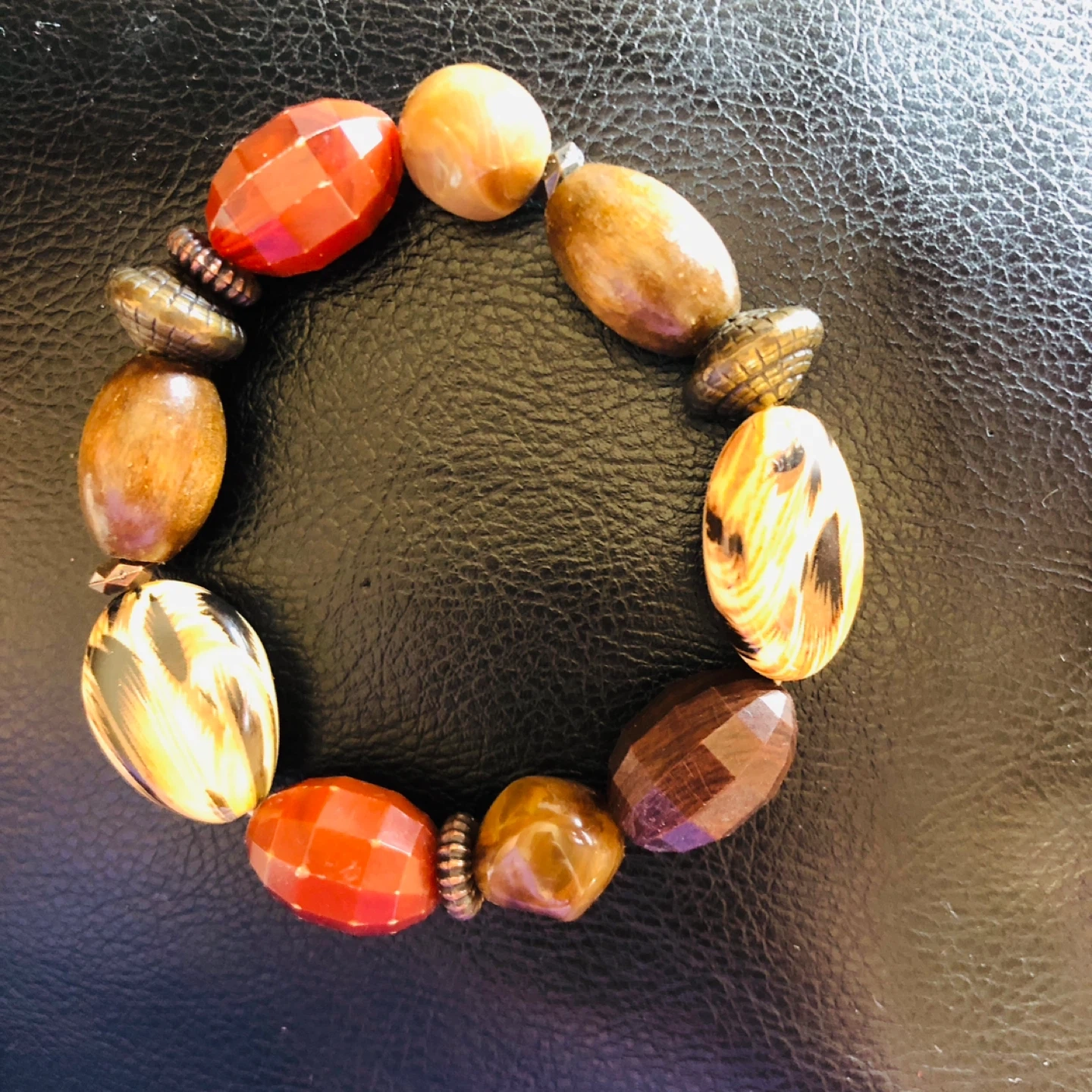 This stretch bracelet features a variety of natural-looking beads in earthy tones and warm reds. It includes smooth, faceted, and patterned beads for a unique look. Its elastic design makes it easy to slip on and off. Great for adding a touch of boho flair to any outfit!