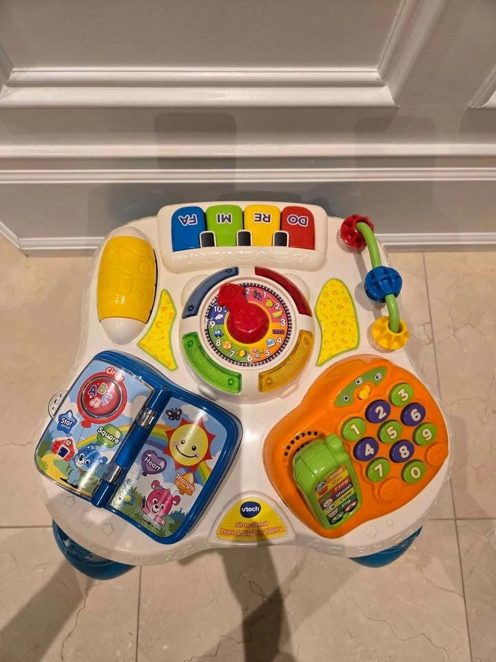 Like new condition, no flaws, no missing parts. Super fun activity center with 6 stations that will keep your little one busy for hours! Features include making phone calls, reading a book, playing the piano, moving clock arms, and shuffling beads. Plays familiar tunes like Twinkle Twinkle Little Star.