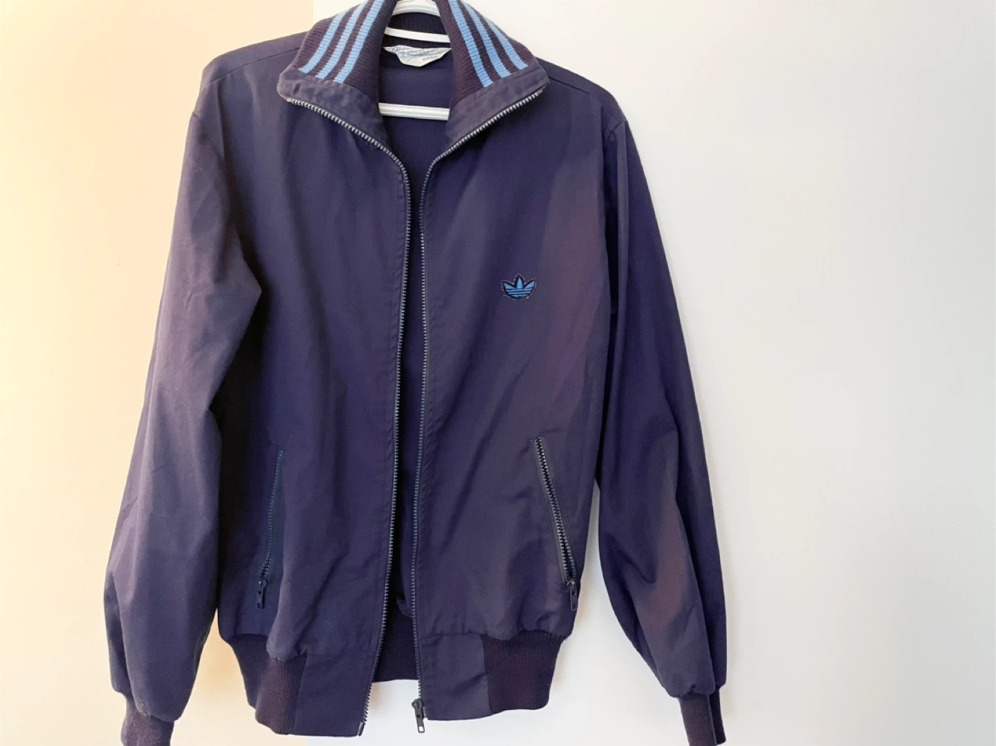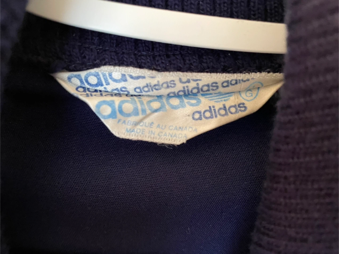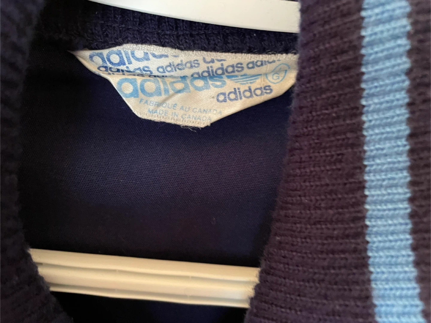 Classic vintage navy blue Adidas track jacket with light blue striped collar and cuffs. 1980s Features the iconic Adidas trefoil logo. Made in Canada. This jacket is great for casual wear or light athletic activities. Only 40$