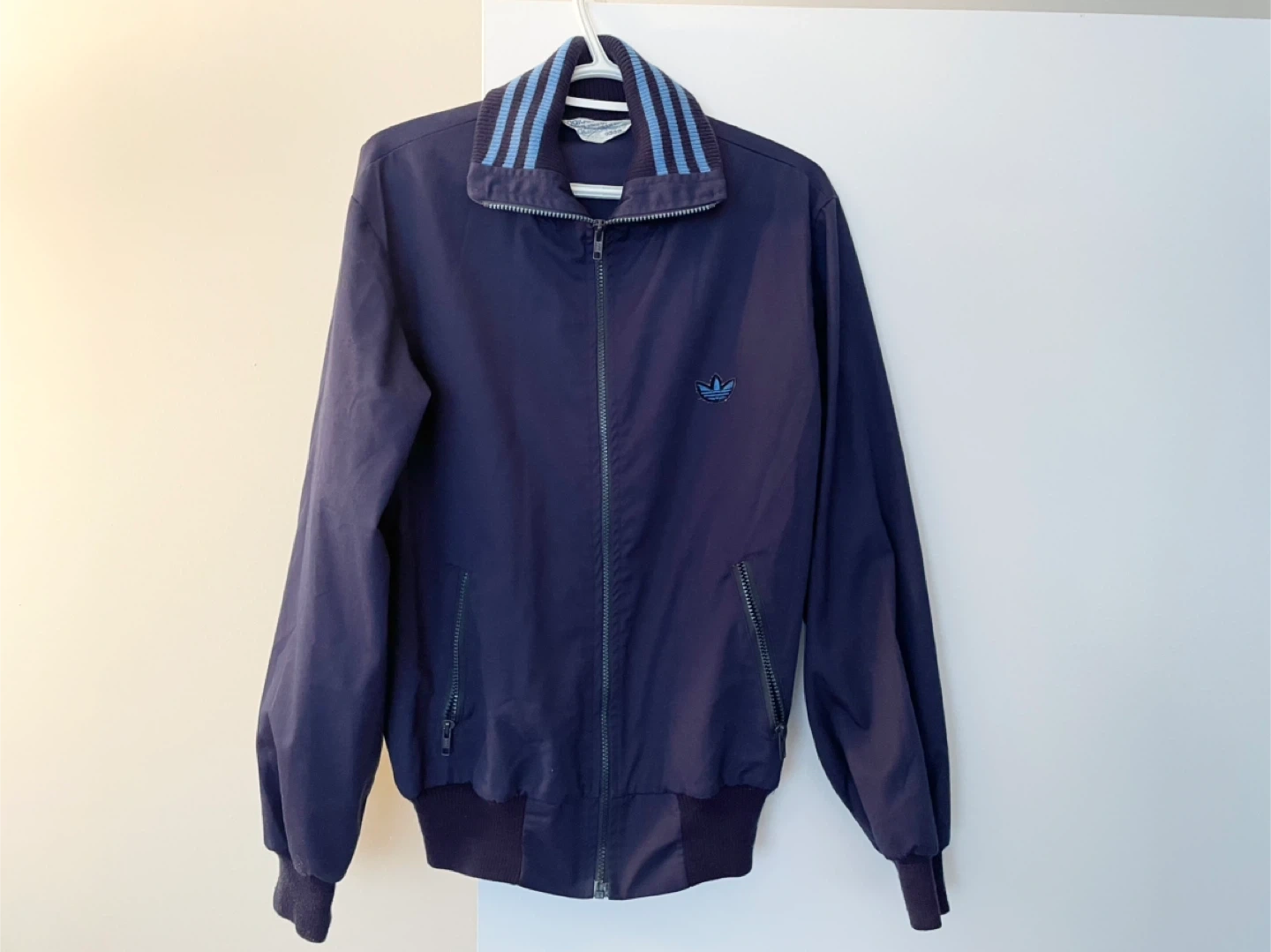 Classic vintage navy blue Adidas track jacket with light blue striped collar and cuffs. 1980s Features the iconic Adidas trefoil logo. Made in Canada. This jacket is great for casual wear or light athletic activities. Only 40$