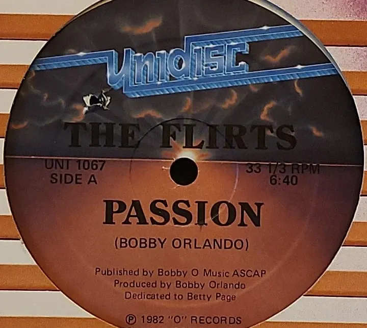 This is a 12" vinyl single featuring the song "Passion" by The Flirts. It's produced by Bobby Orlando and was released in 1982. The record spins at 33 1/3 RPM and has a duration of 6:40 for Side A. NO SKIPS!