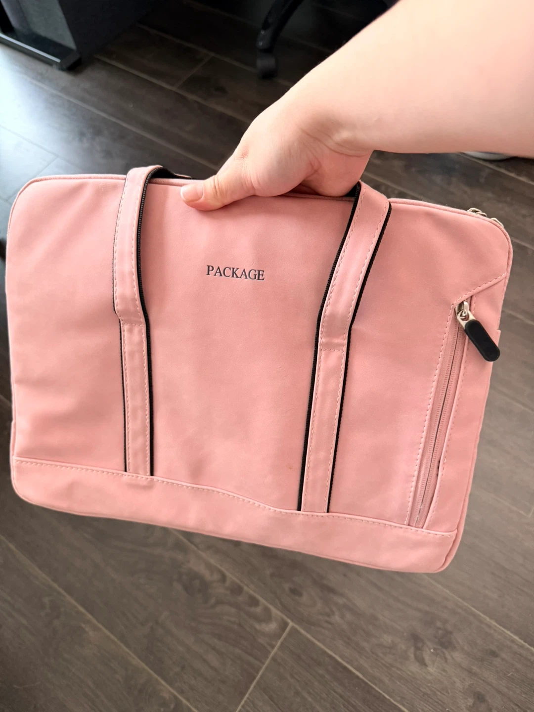 pink laptop bag with "PACKAGE" printed on it. The interior is padded for protection. It’s ripped on the side pocket but for a laptop is useful and still works perfectly. Pick up only in Brentwood concord