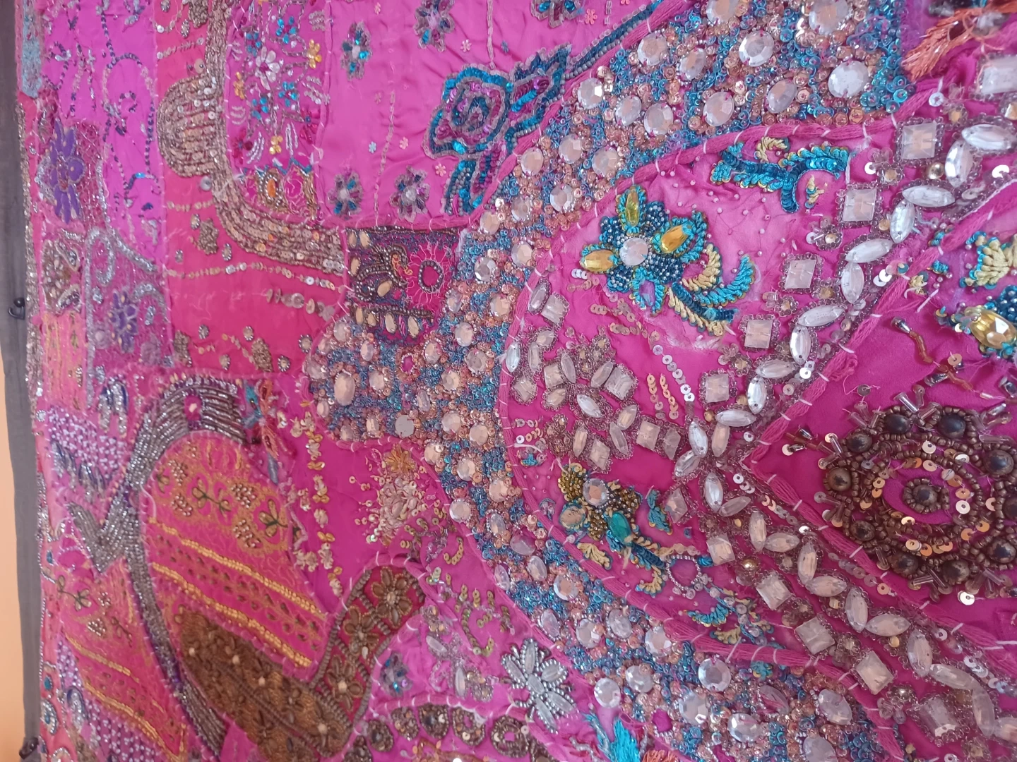 This vibrant wall tapestry is embellished with intricate beadwork, sequins, and embroidery. Its unique patchwork design features a dazzling array of colours and patterns. It's a beautiful piece for adding texture and visual interest to any room!