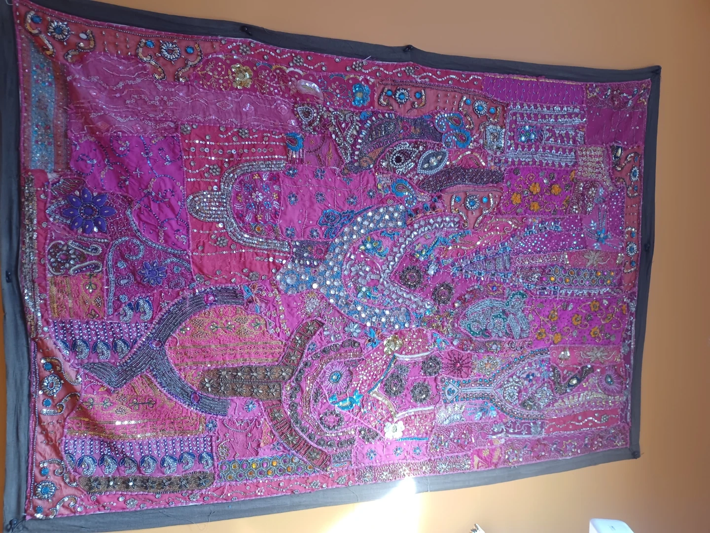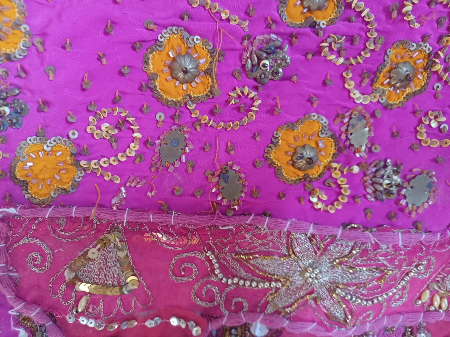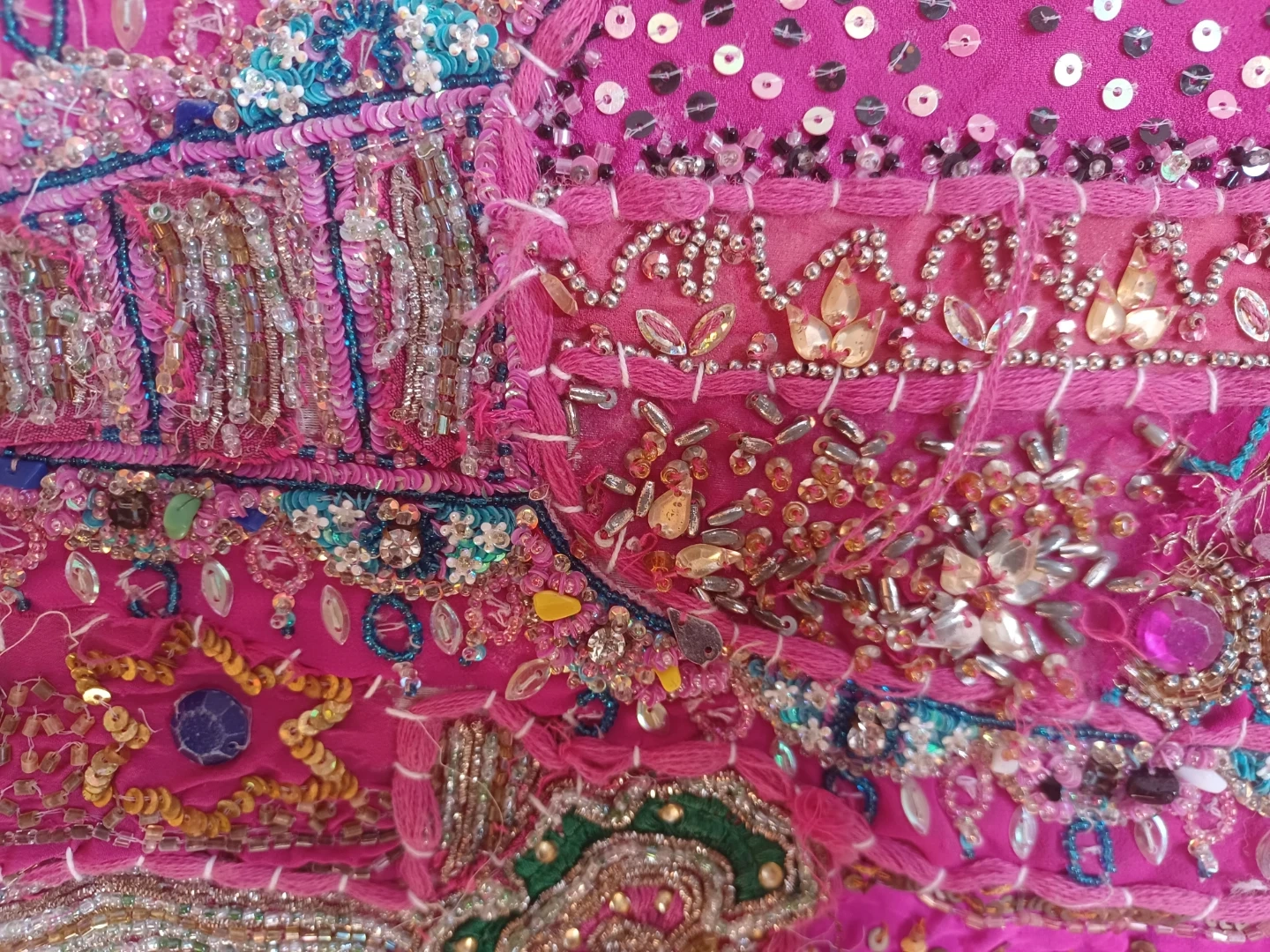 This vibrant wall tapestry is embellished with intricate beadwork, sequins, and embroidery. Its unique patchwork design features a dazzling array of colours and patterns. It's a beautiful piece for adding texture and visual interest to any room!