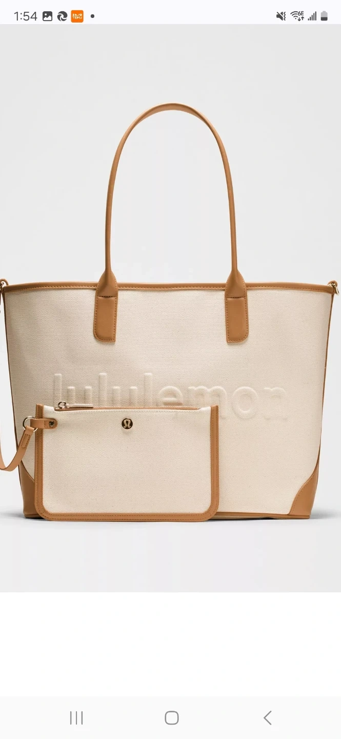 This Lululemon canvas tote bag is a stylish and practical accessory. It comes with a matching canvas pouch. It's a great bag for everyday use or for carrying your gym essentials.