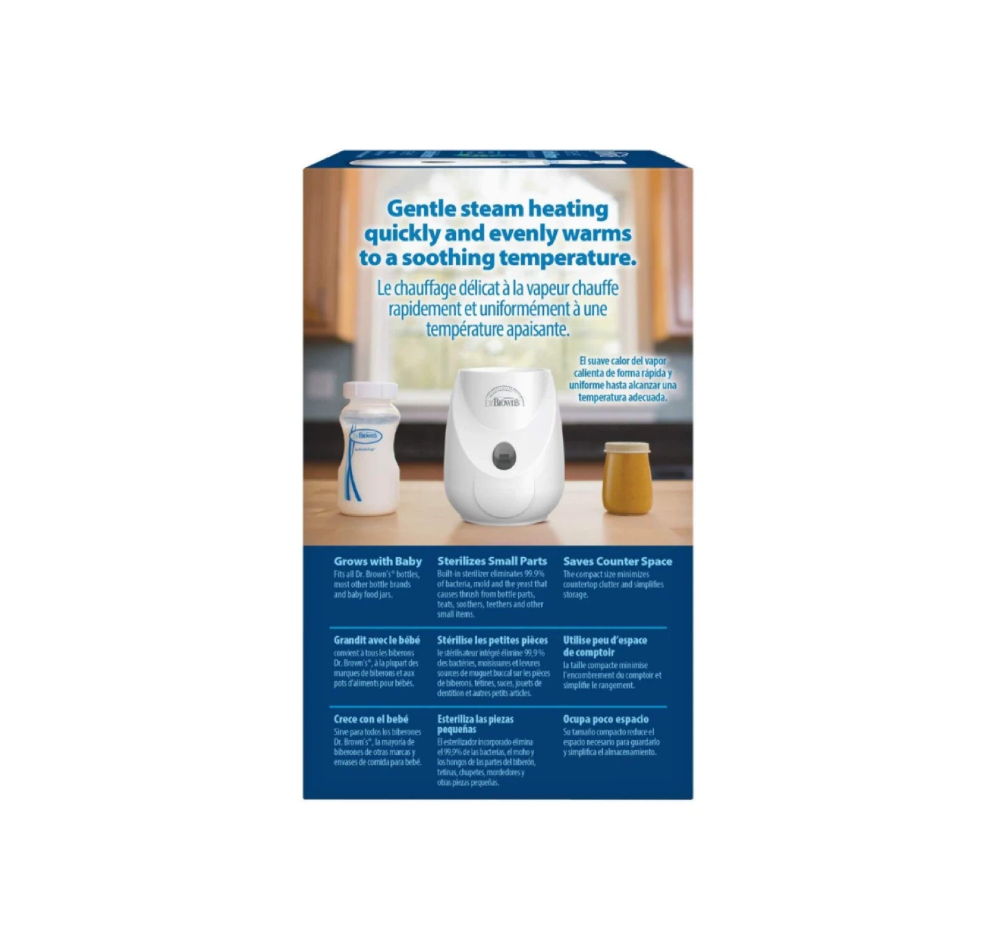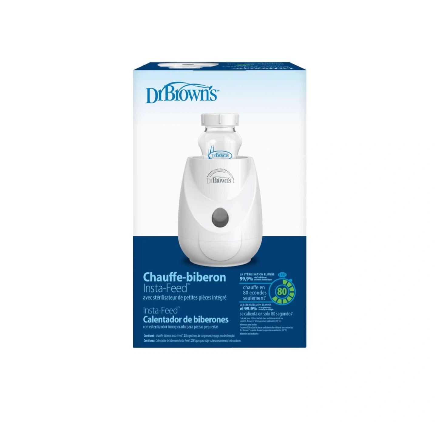 Quickly and safely warm baby bottles and food jars with Dr. Brown’s™ Insta-Feed™ Bottle Warmer and Sterilizer! This baby bottle warmer is compact to minimize clutter and warms in as little as 80 seconds