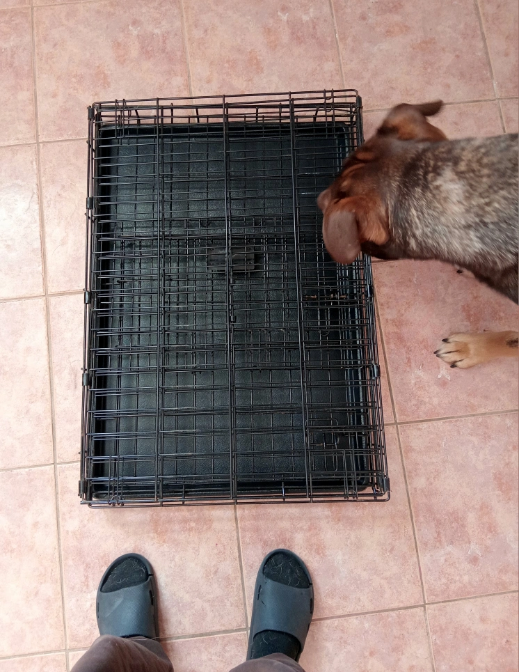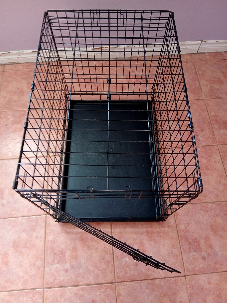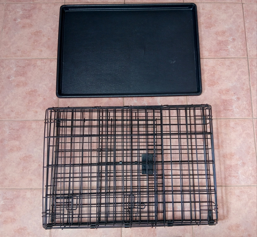 This is a black wire, single door, dog crate with a removable plastic tray. It folds flat for storage. This crate is handy for training or travel.