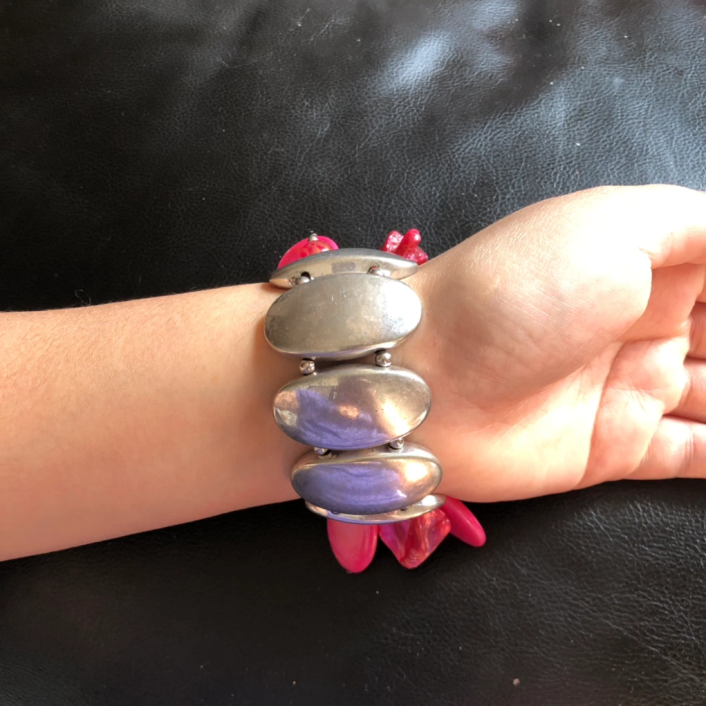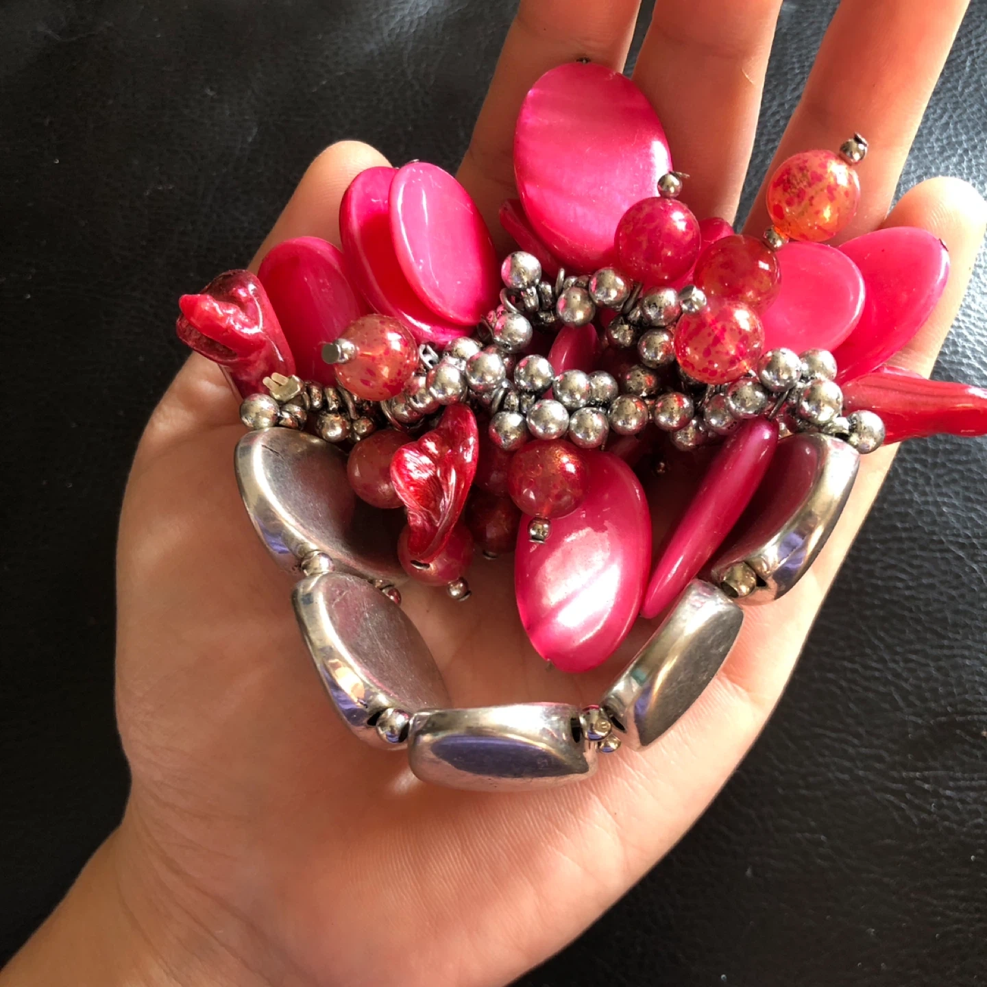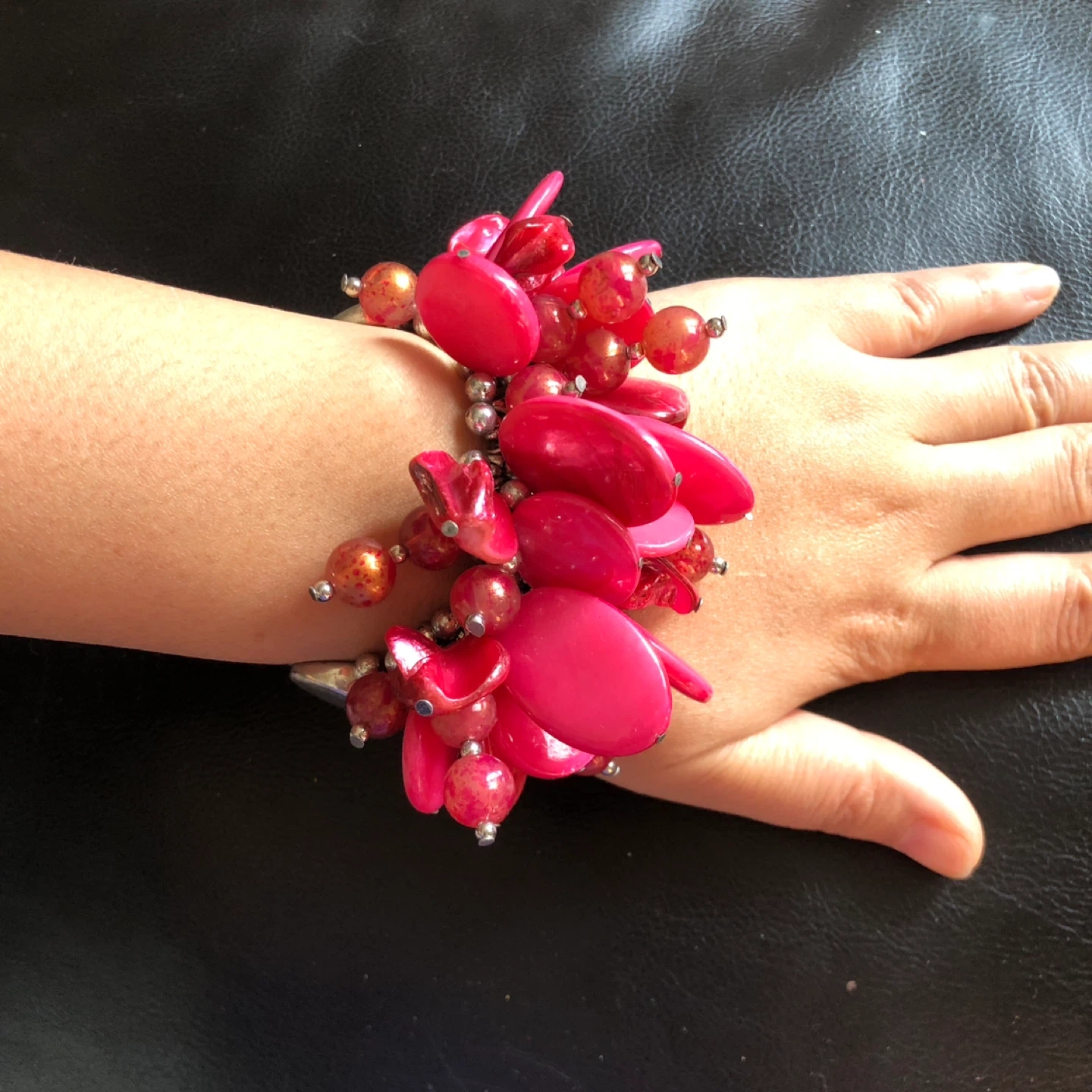 This bold bracelet features a mix of shiny red and pink beads with silver-toned accents. It's designed with a cluster of large, flat, and round beads for a striking look. The silver-toned oval links add a polished finish to this statement piece.