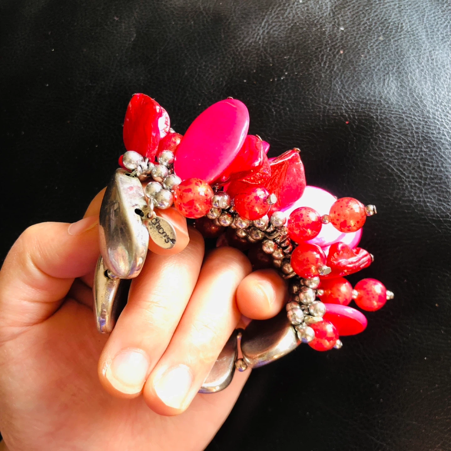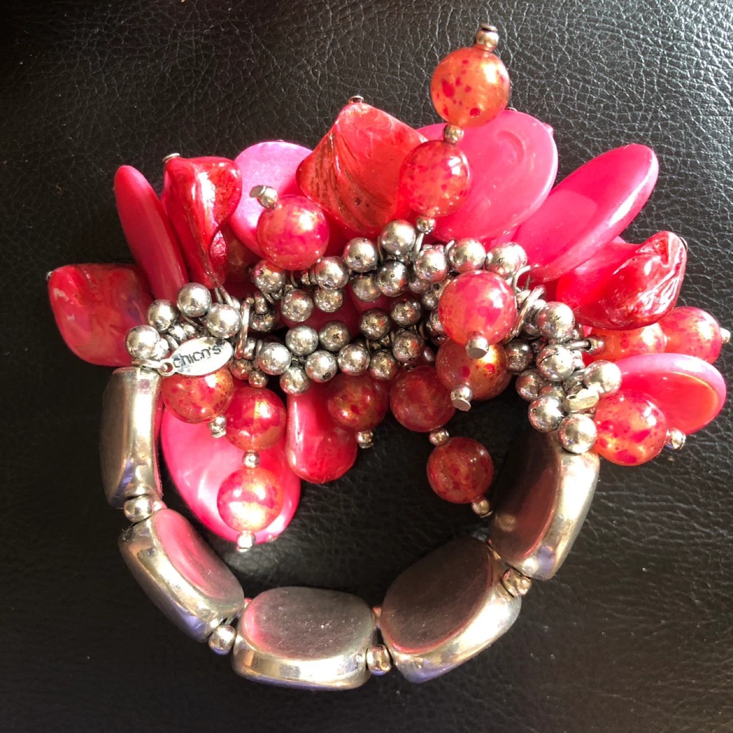 This bold bracelet features a mix of shiny red and pink beads with silver-toned accents. It's designed with a cluster of large, flat, and round beads for a striking look. The silver-toned oval links add a polished finish to this statement piece.