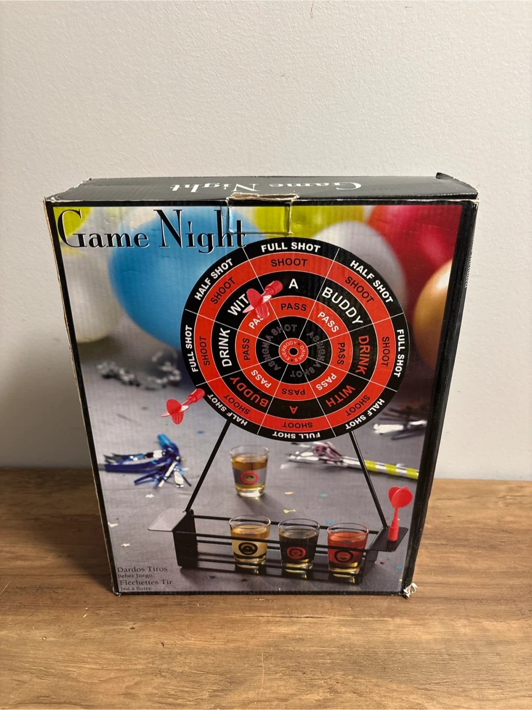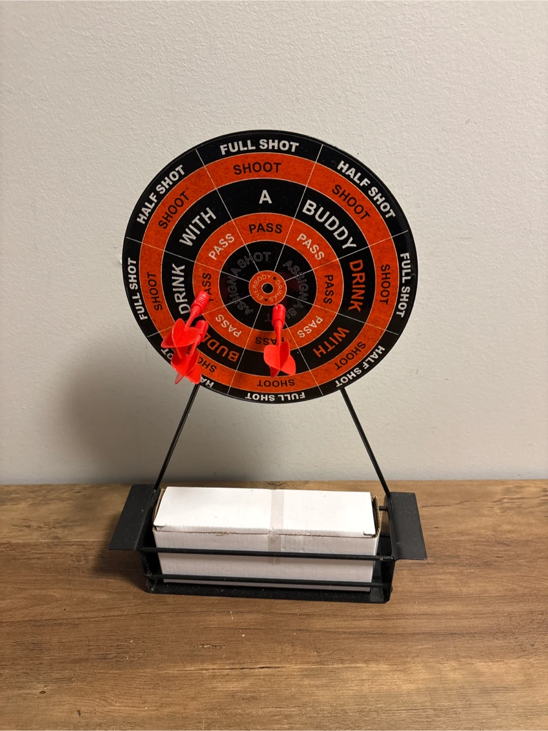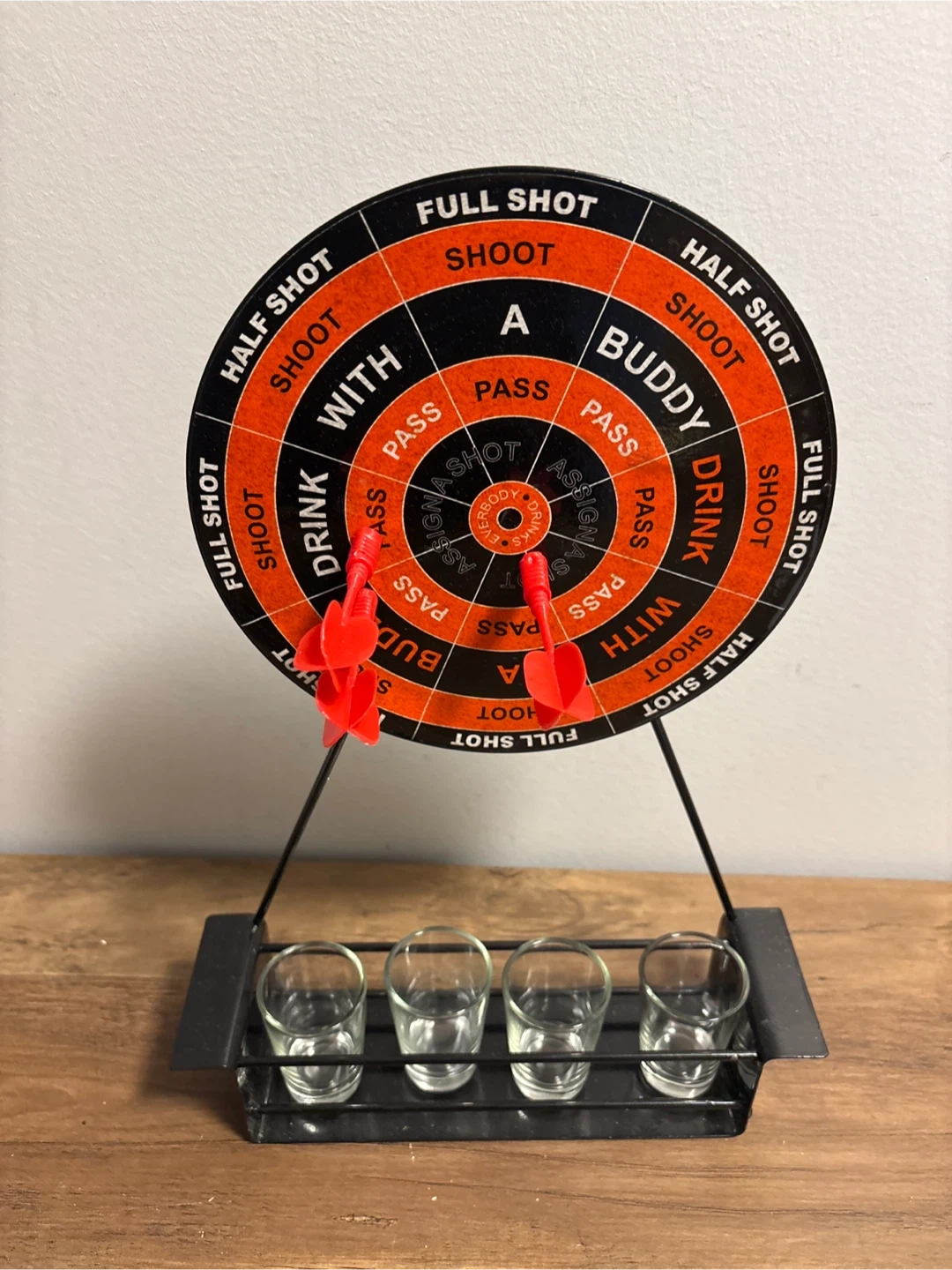 Fun shot glass dartboard game set. Includes the dartboard, stand, darts, and four shot glasses. Great for parties or casual get-togethers!