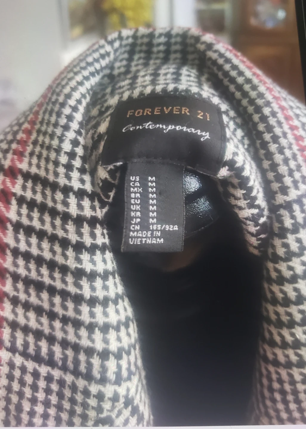This is a Forever 21 Contemporary houndstooth blazer. It's a size medium. Made in Vietnam. Double-breasted with two button closure.