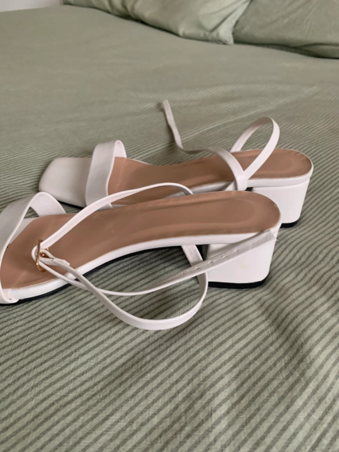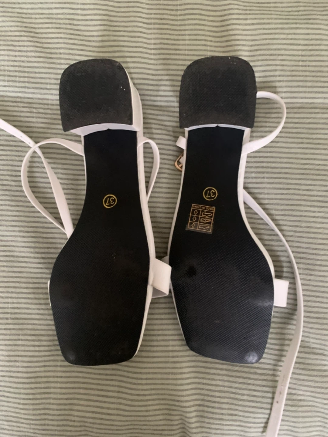 These are off white block heel sandals with a square toe and ankle strap. They have a faux leather finish and a low heel. Size 37.
