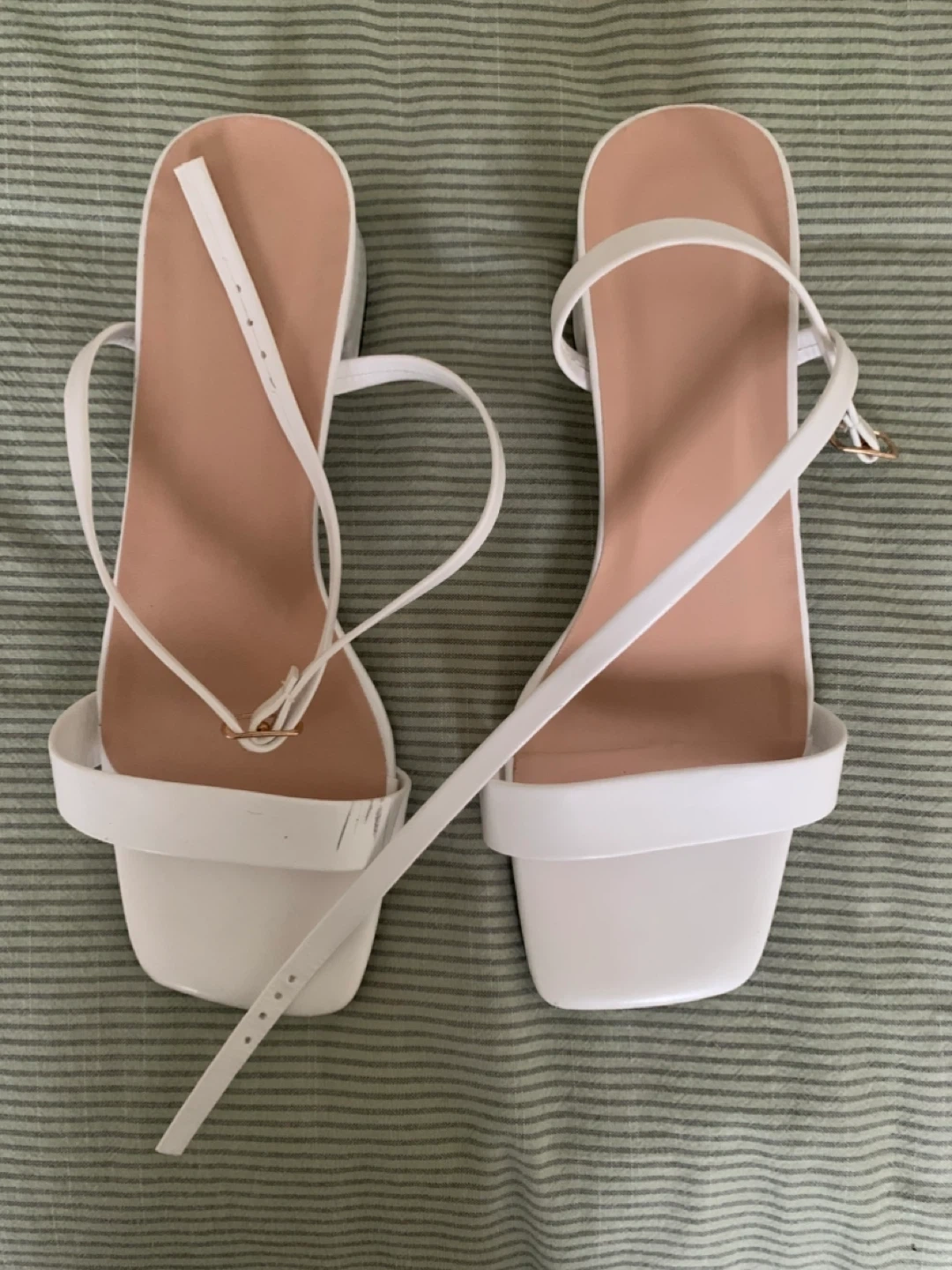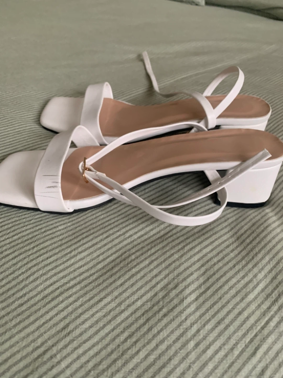 These are off white block heel sandals with a square toe and ankle strap. They have a faux leather finish and a low heel. Size 37.
