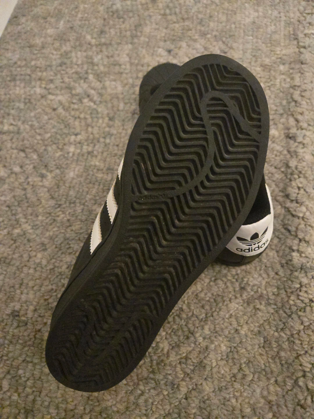Classic Adidas Superstar sneakers in black with white stripes. Features OrthoLite sockliner for comfort and durable rubber shell toe. Made in Indonesia. Size is US 4.5., EUR 36.5 . Fits me, I'm a size 5-6