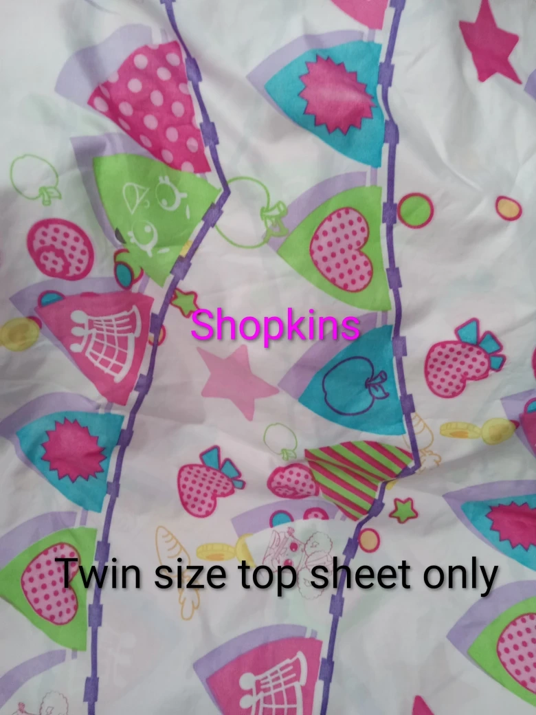 This is a Shopkins twin size top sheet. It's made of fabric and features a colourful print. A twin size top sheet is useful for a child's bed or as a lightweight blanket.