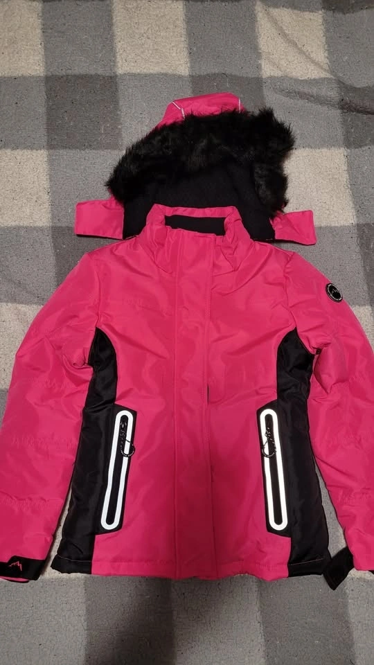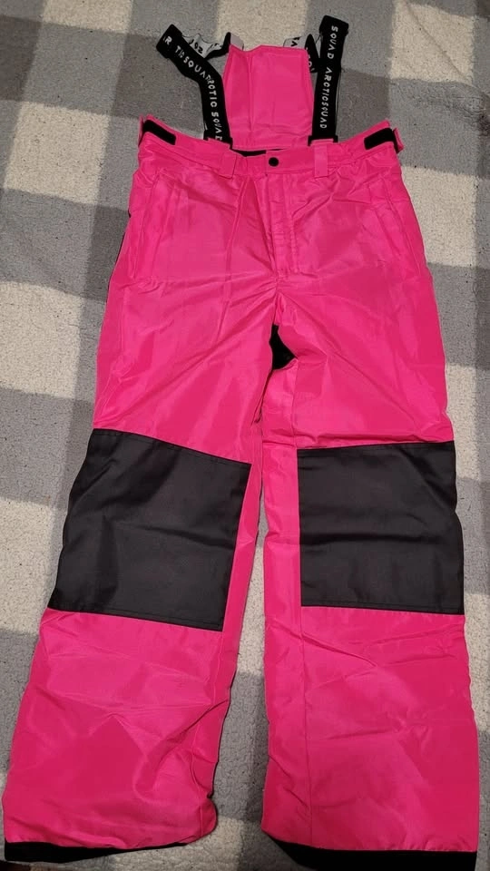 This high-quality snowsuit was worn only ONCE and is in new condition. It features a stylish pink and black design, offering both functionality and fashion for winter activities. The jacket includes a fleece-lined hood, long sleeves with storm cuffs and adjustable Velcro, and a full-zip closure for optimal warmth and protection. The pants are designed with reinforced knees for durability. Perfect for keeping your child warm and comfortable during cold weather. Available for pickup.
