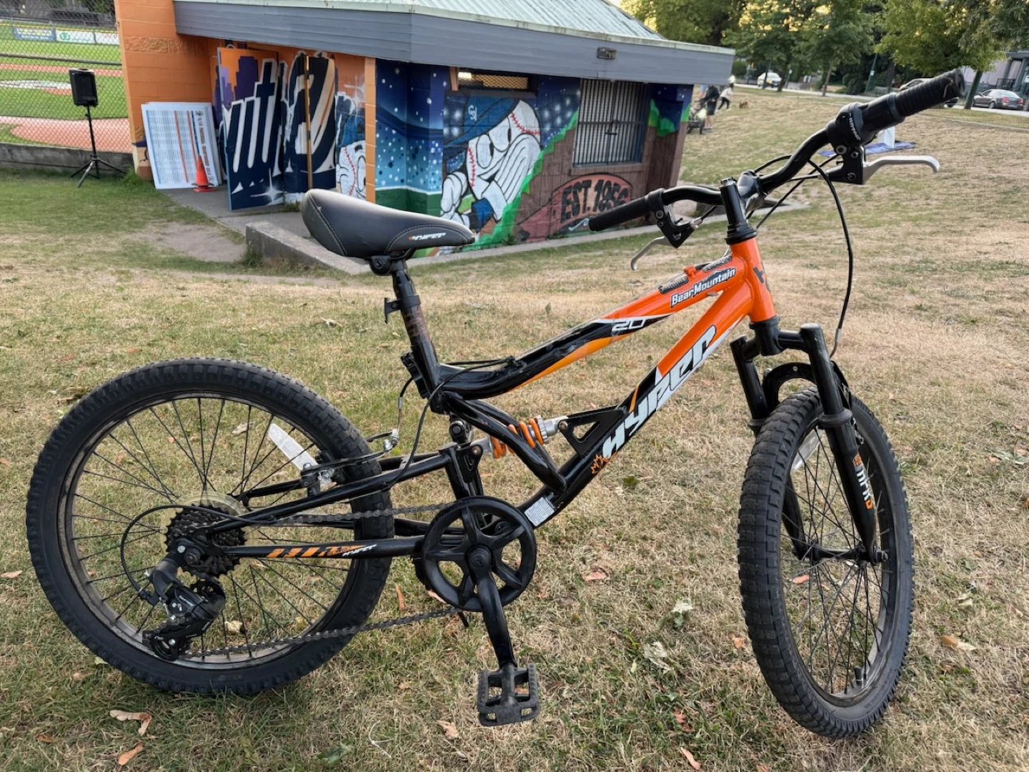 Orange and black Hyper Bear Mountain full suspension bike. It has 20-inch wheels and disc brakes. This bike is suitable for trail riding.