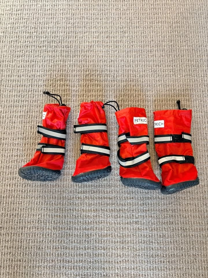 Petrich Long-Legged knee-high waterproof winter dog boots. Feature 2 Velcro Straps on each to secure them well. Size 7, suitable for medium-sized dogs. Color is red. Brand new, never used; purchased the wrong size and missed the return window.