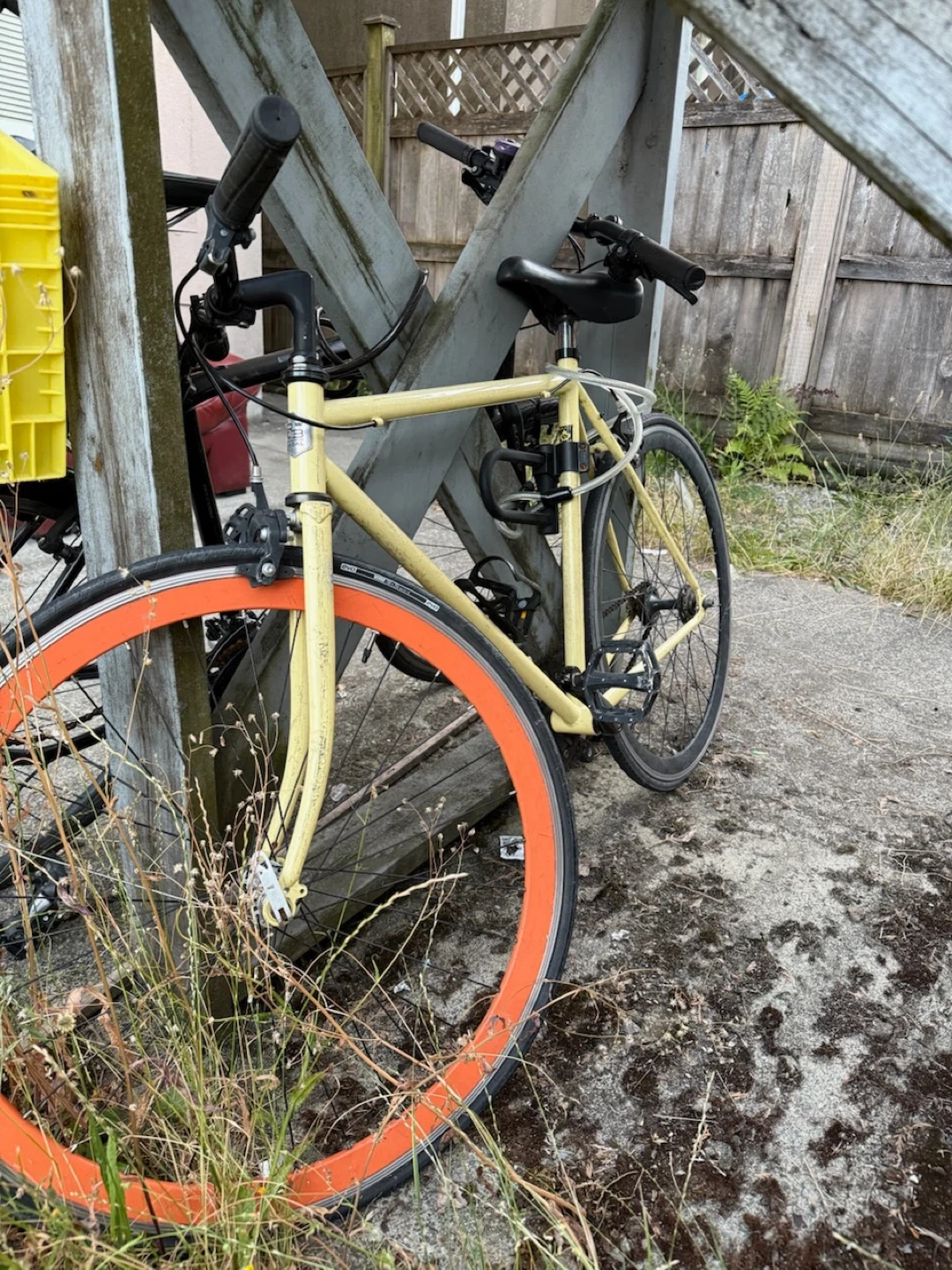 Single speed bicycle in yellow with striking orange rims. It features black handlebars, seat, and tires. Great for city commuting!