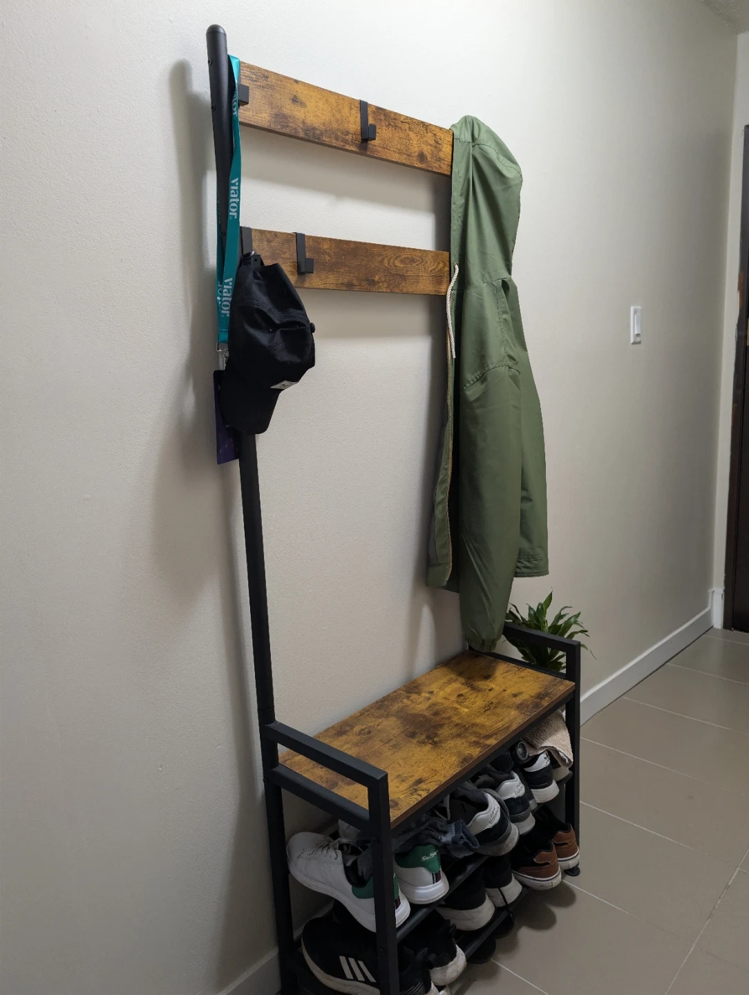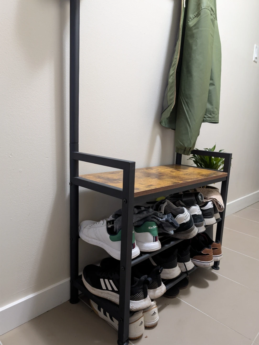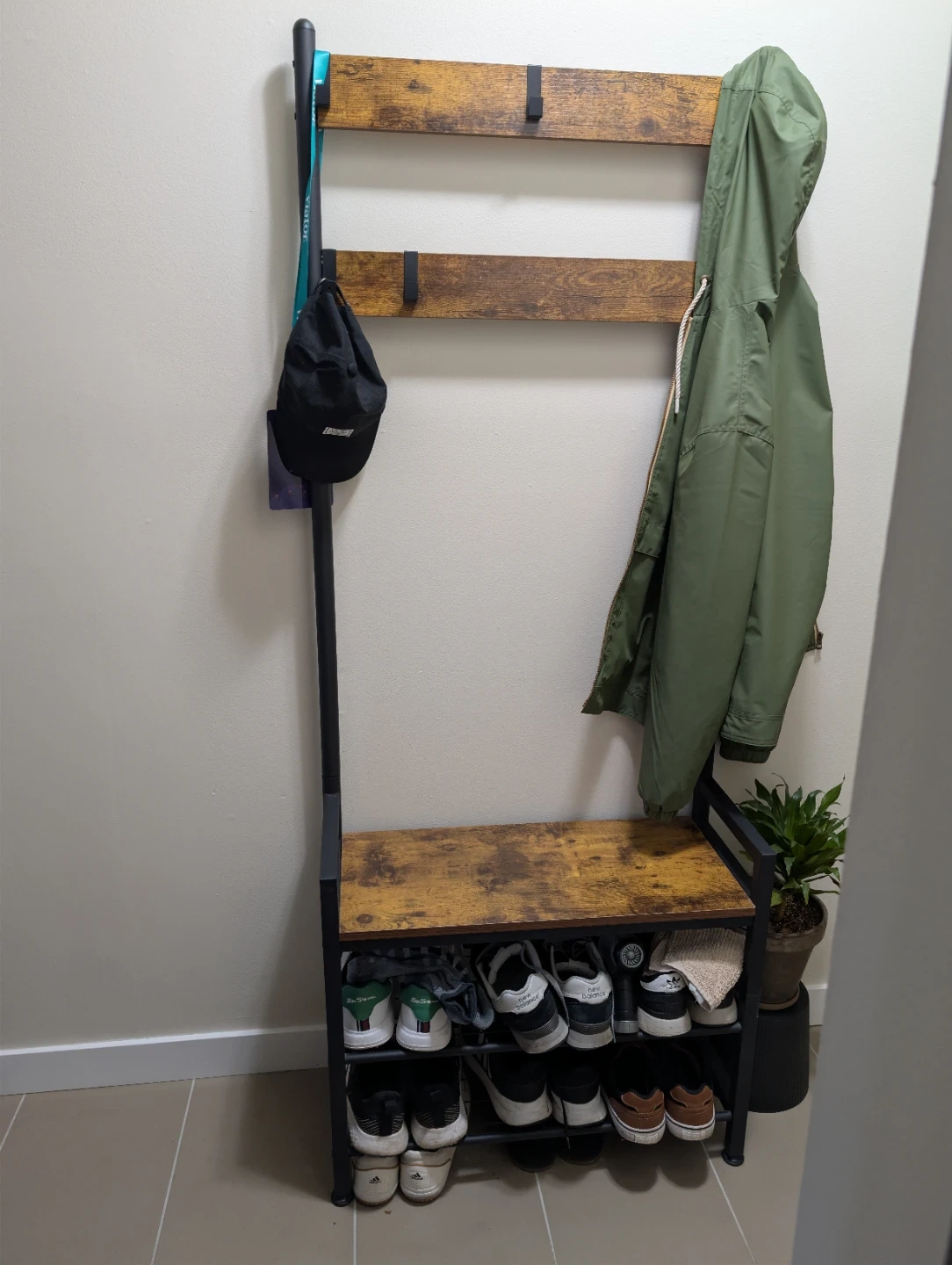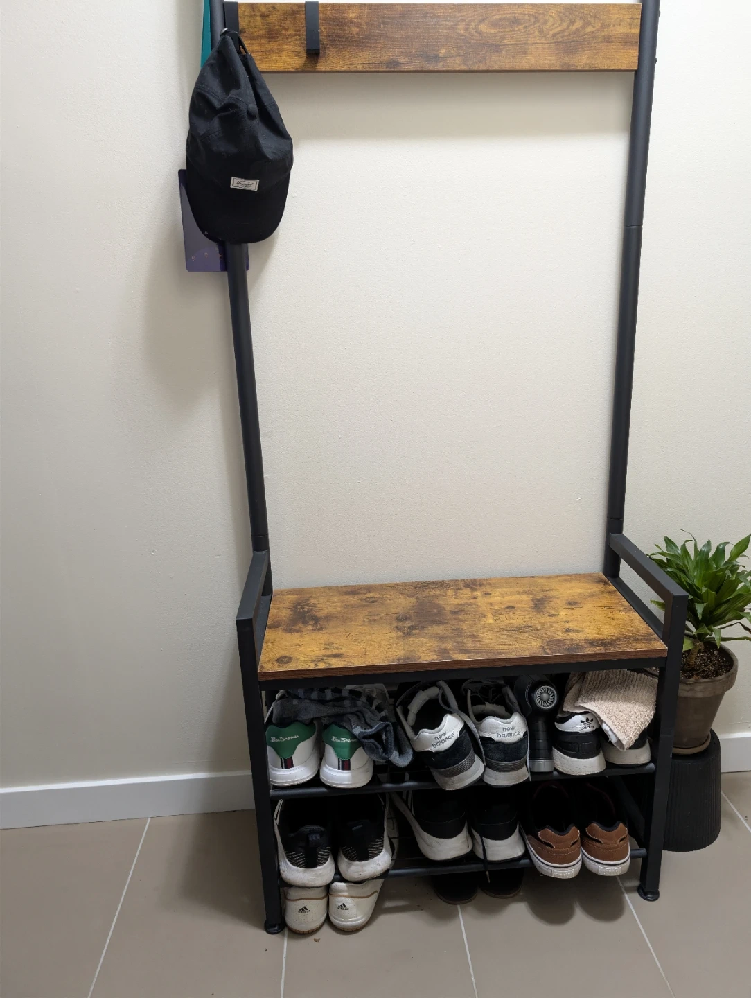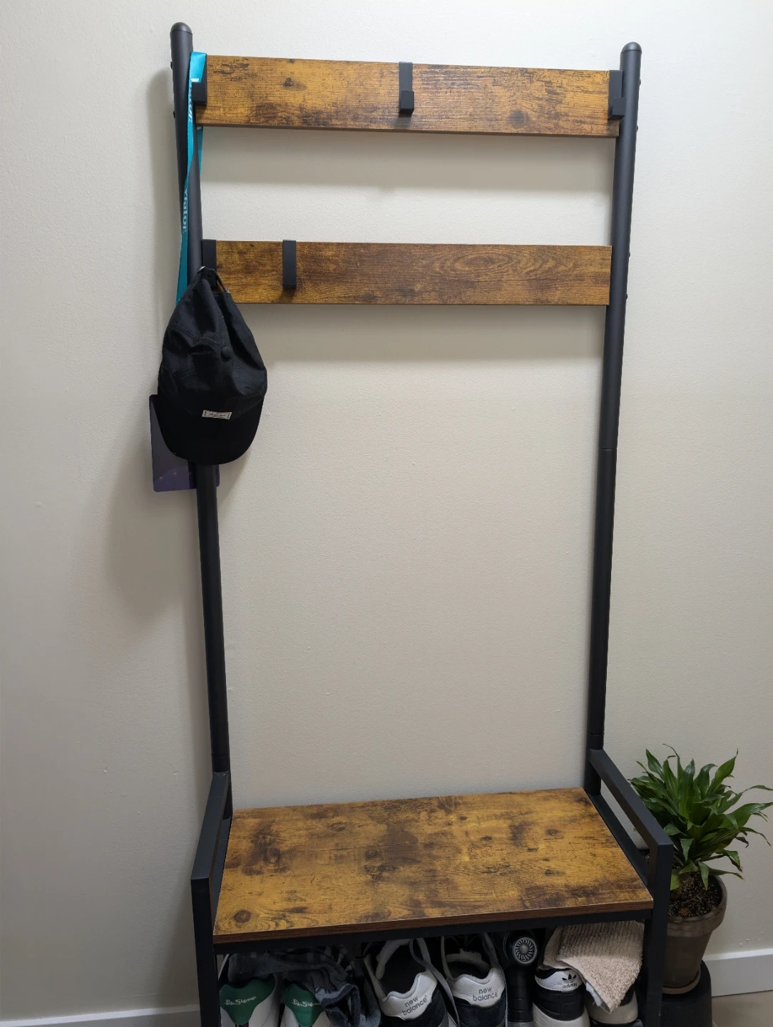 This hall tree features a bench with shoe storage shelves and coat hooks. It's made with a rustic wood-look top and metal frame. Perfect for organizing entryway essentials!