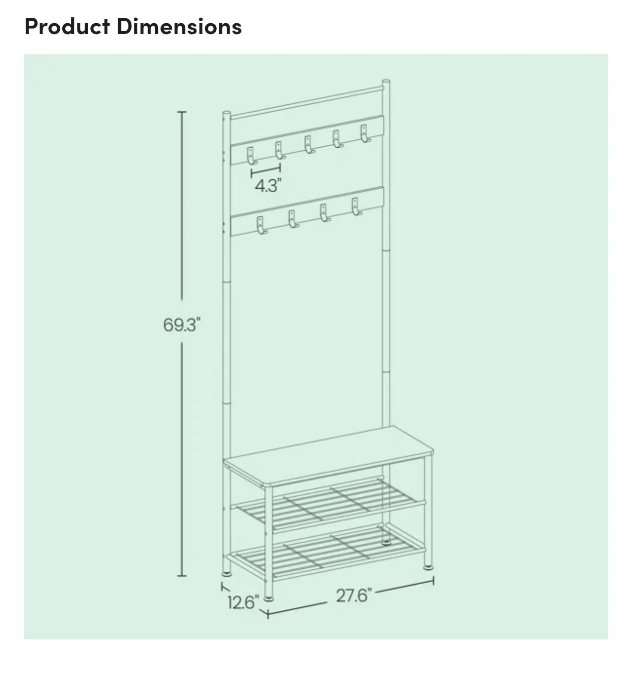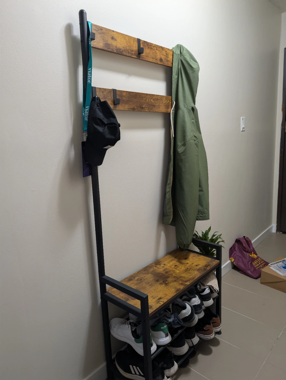 This hall tree features a bench with shoe storage shelves and coat hooks. It's made with a rustic wood-look top and metal frame. Perfect for organizing entryway essentials!