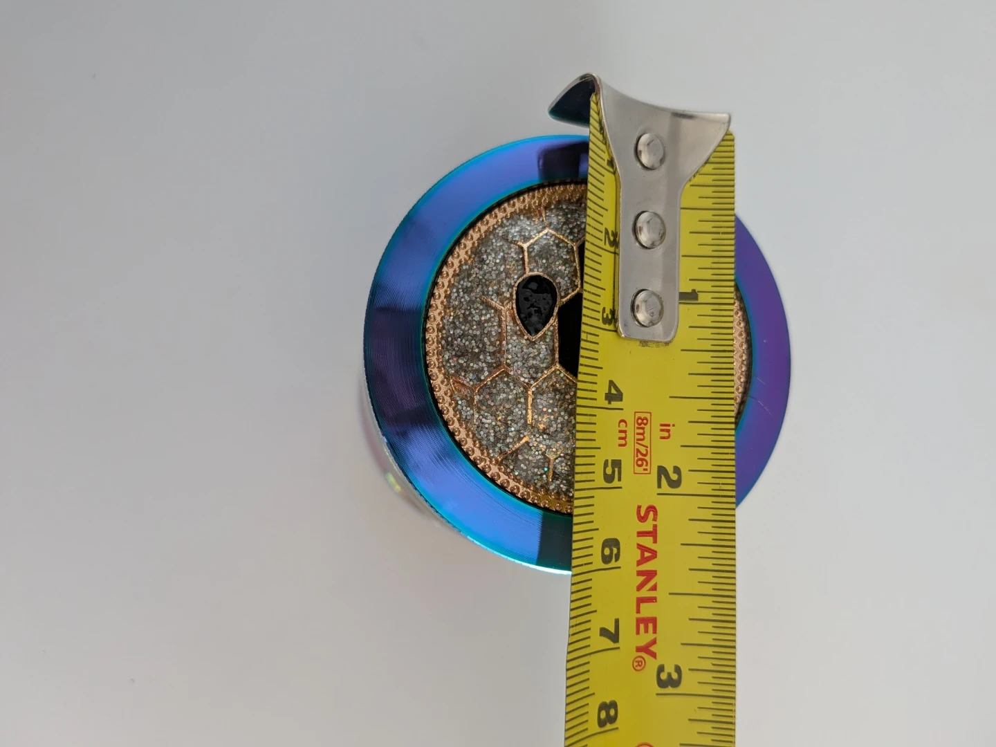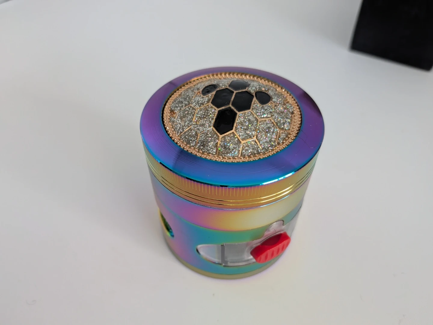 This four-piece herb grinder features a rainbow metallic finish and sharp, durable teeth for efficient grinding. It includes a built-in collection tray to catch fine particles and a mesh screen. The grinder comes in its original box.