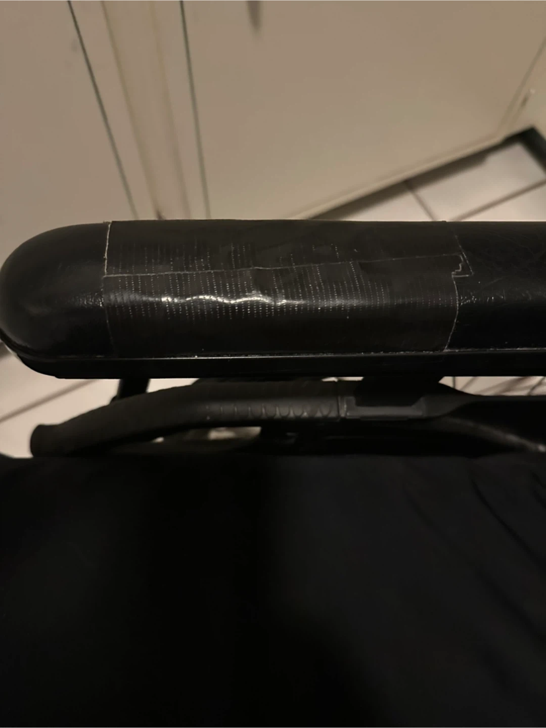 This is a black Motion Composites wheelchair. It's in used condition with some wear on the armrests. It features large rear wheels and smaller front casters.