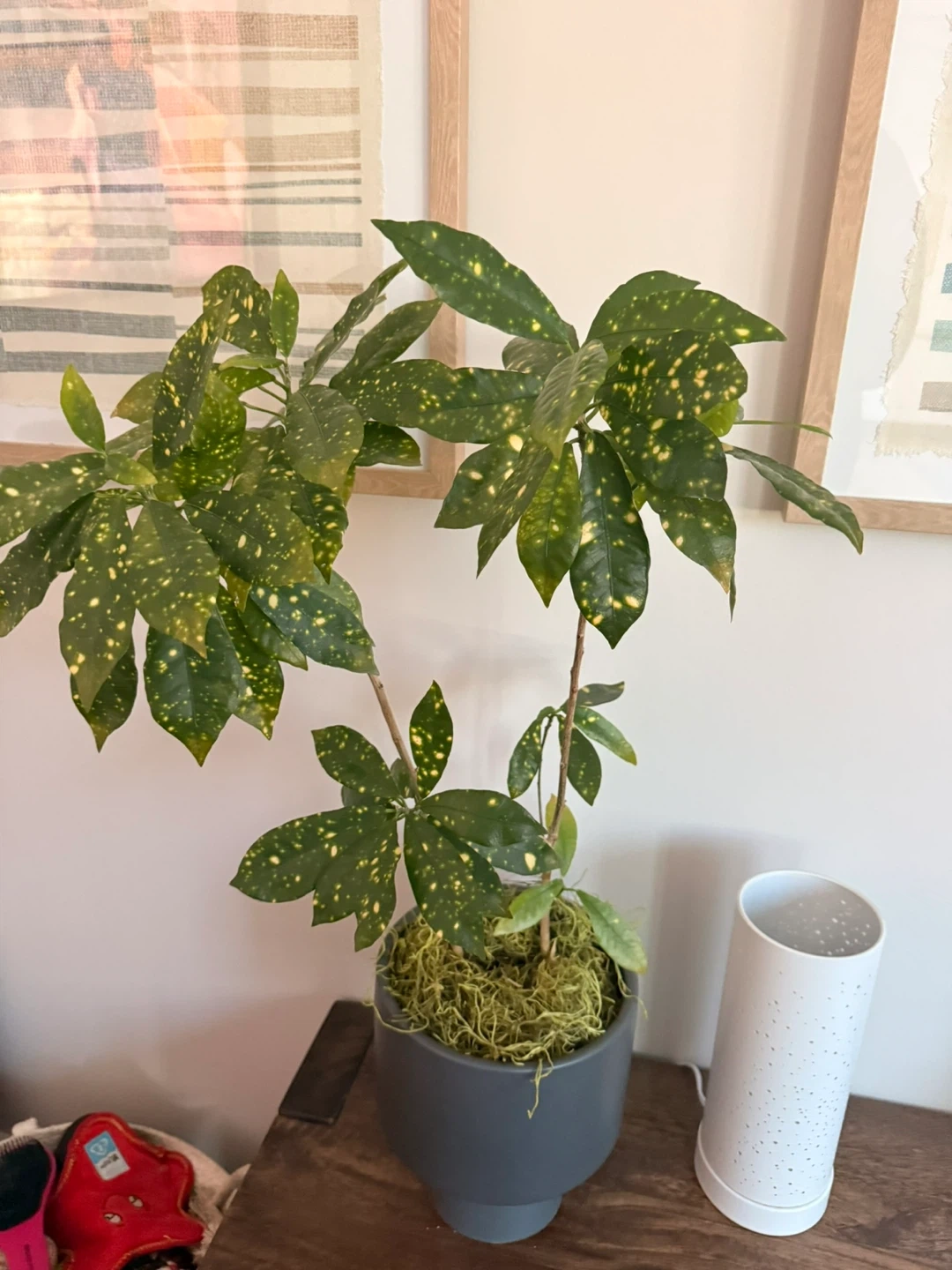 This spotted Aucuba plant features vibrant green leaves with yellow speckles. It's housed in a stylish grey pot, topped with decorative moss. This plant adds a touch of natural beauty to any indoor space.