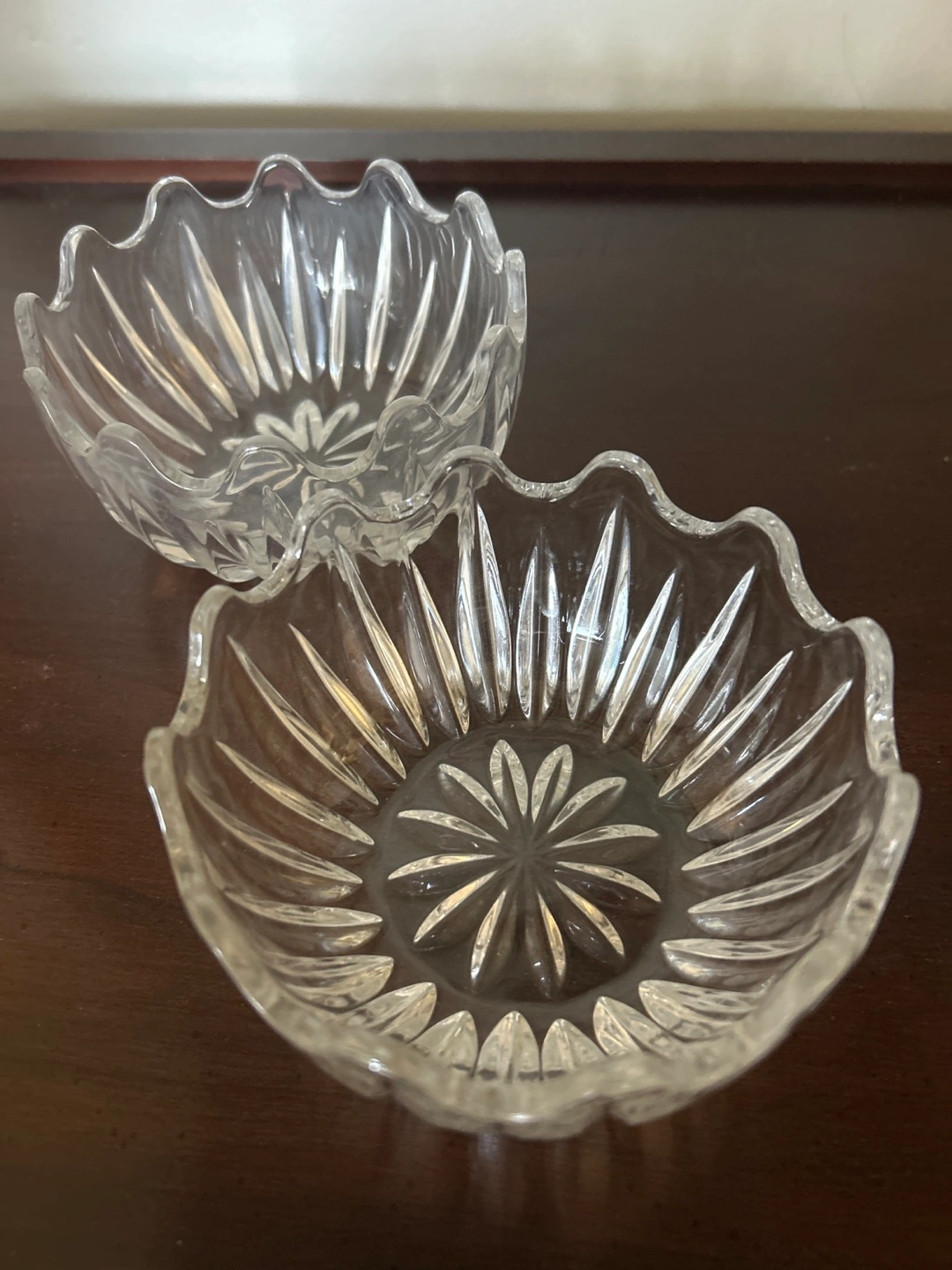 These are two clear glass serving bowls. They feature a fluted design with a starburst pattern in the center. Perfect for snacks or small side dishes!