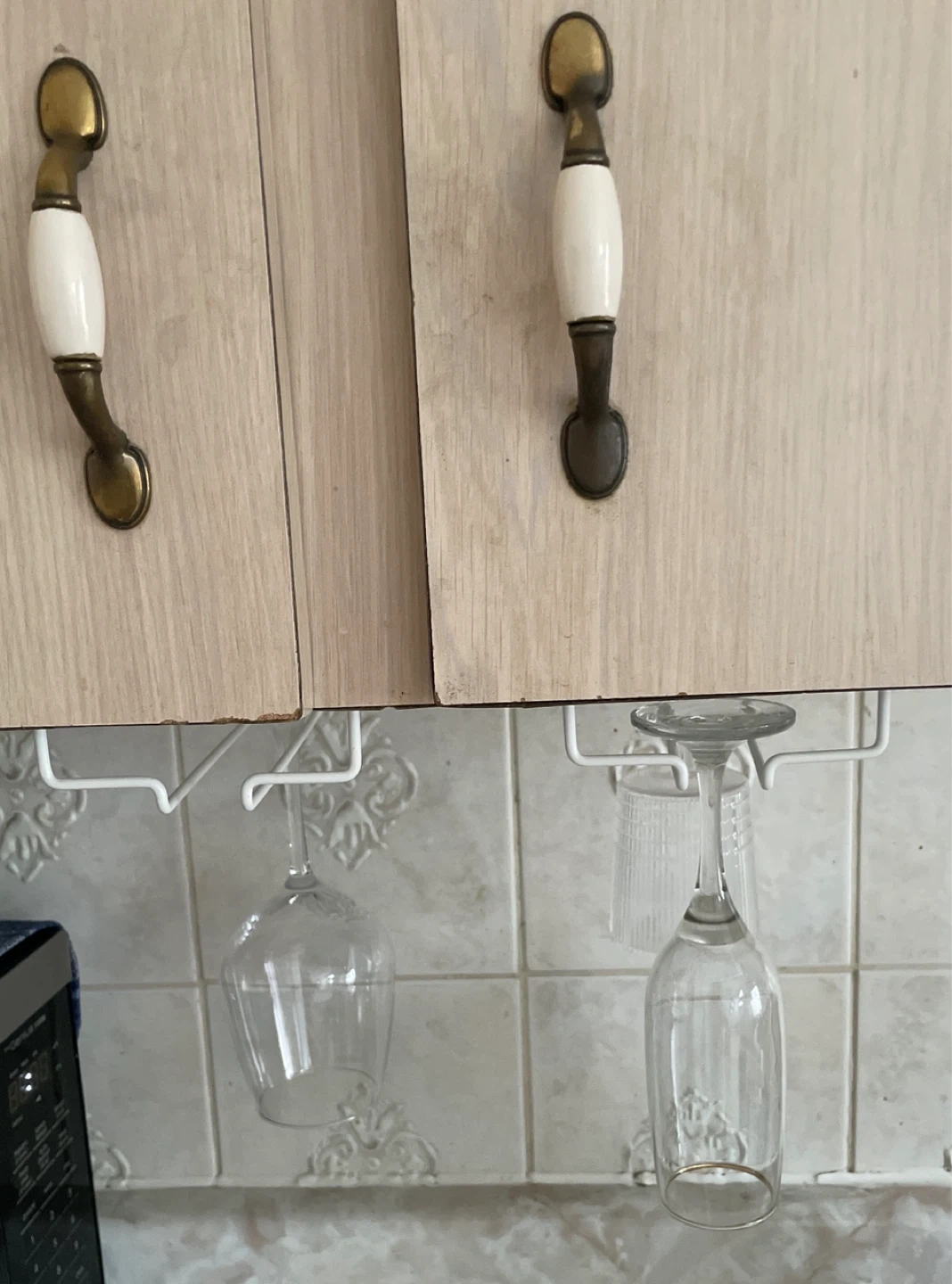 These under cabinet racks hold wine glasses, keeping your countertops clear. They are made of metal and mounts easily under your cupboards. Perfect for keeping glasses handy for when guests visit!