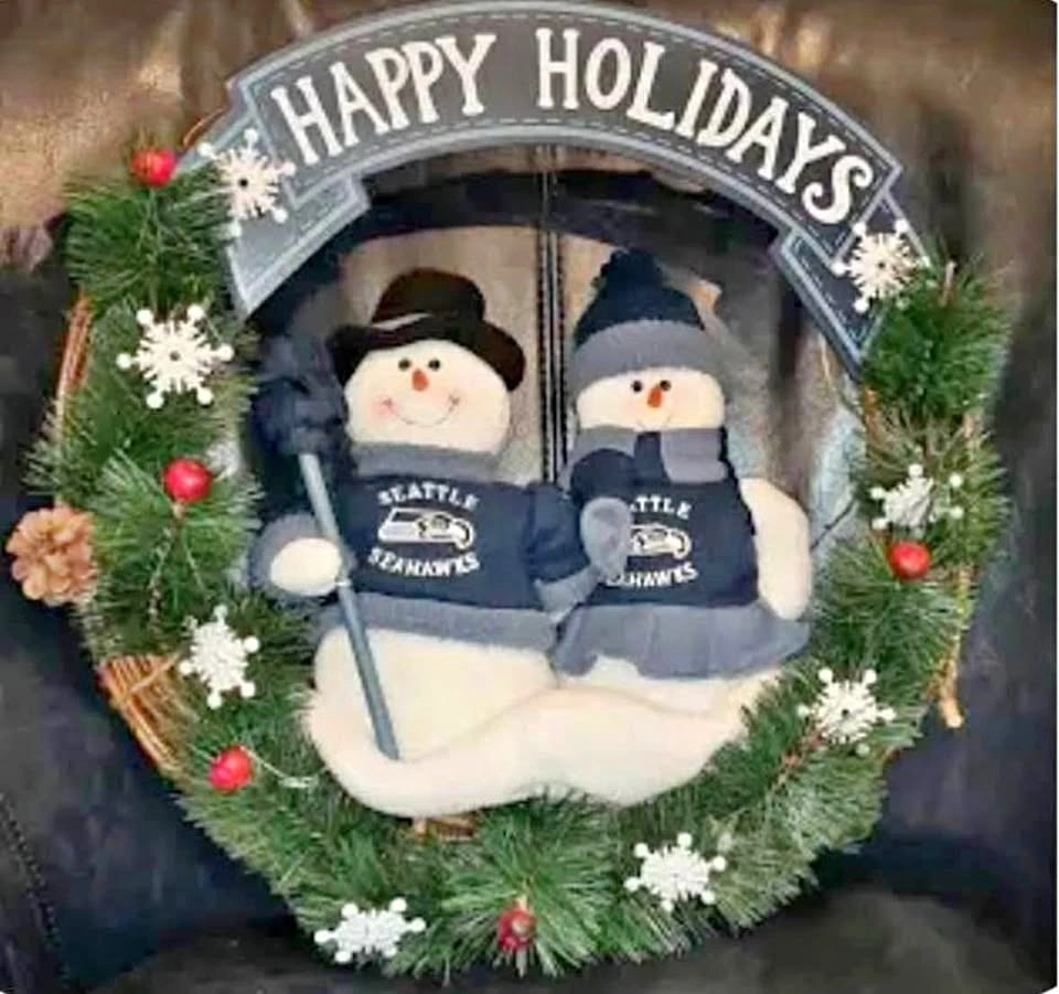 Festive Seattle Seahawks holiday wreath with two cute snowmen wearing Seahawks gear. Comes with a 'Happy Holidays' sign on top. Decorated with pine branches, red berries, and snowflakes. Perfect for any Seahawks fan to show some team spirit during the holidays!