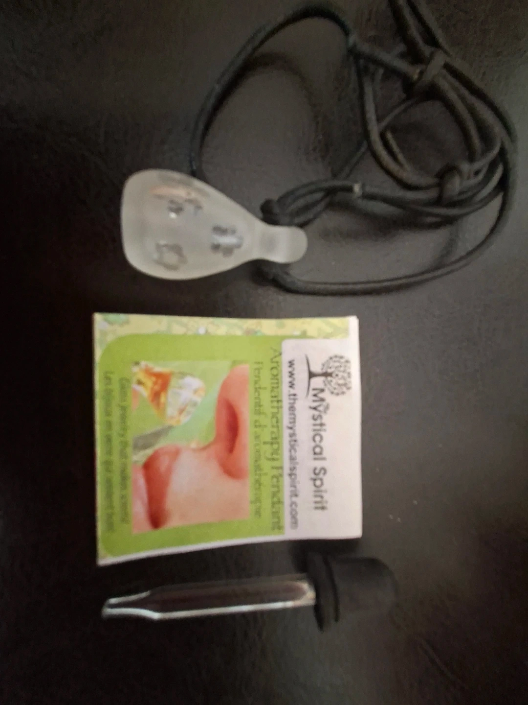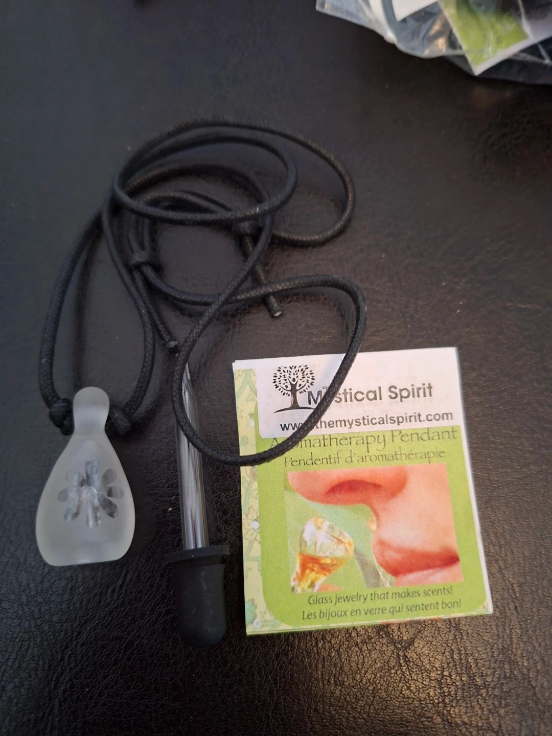 Frosted glass pendant necklace from Mystical Spirit, designed for aromatherapy. It comes with an applicator. Glass jewelry that makes scents!