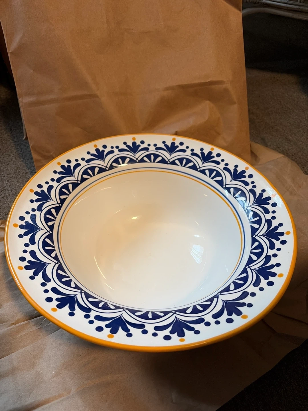 This is a large serving bowl. It's white with a decorative blue and yellow rim pattern. Microwave and dishwasher safe