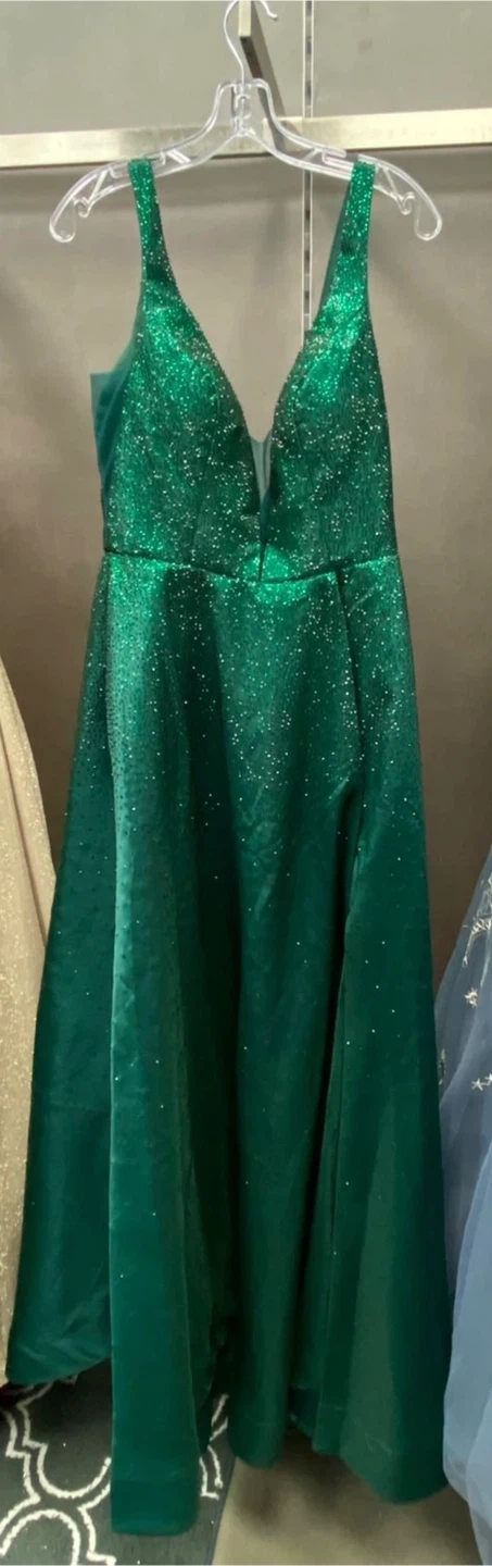 This emerald green gown features a sparkling sequin bodice and a flowy skirt with a high slit. It's designed with a V-neckline and a flattering A-line silhouette. Perfect for a formal event or a special occasion!