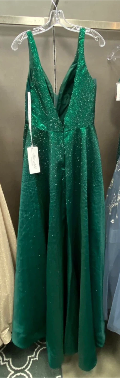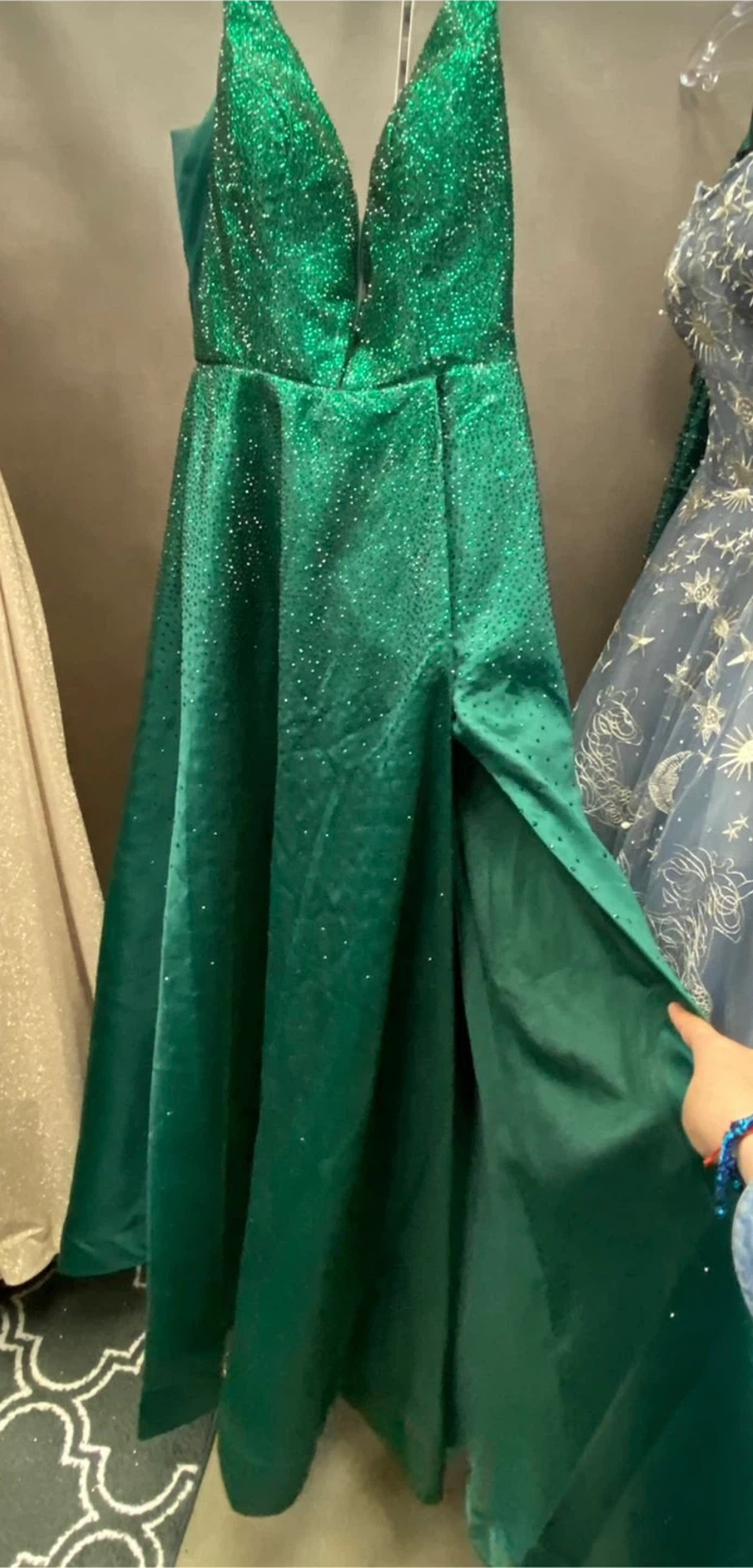 This emerald green gown features a sparkling sequin bodice and a flowy skirt with a high slit. It's designed with a V-neckline and a flattering A-line silhouette. Perfect for a formal event or a special occasion!