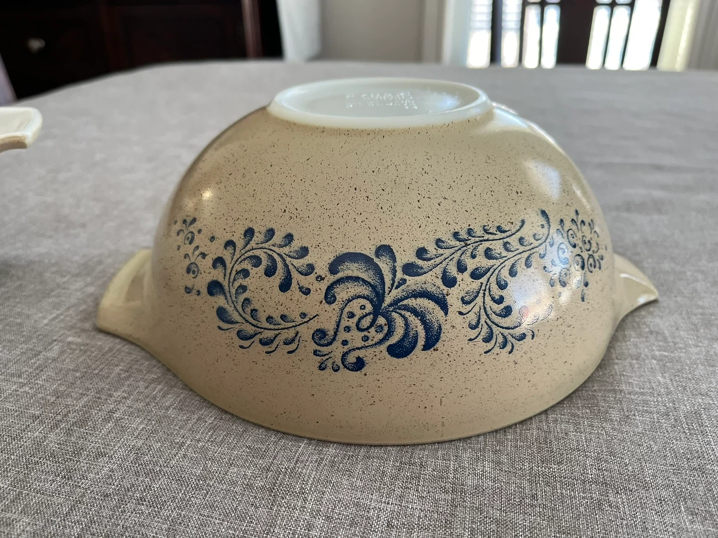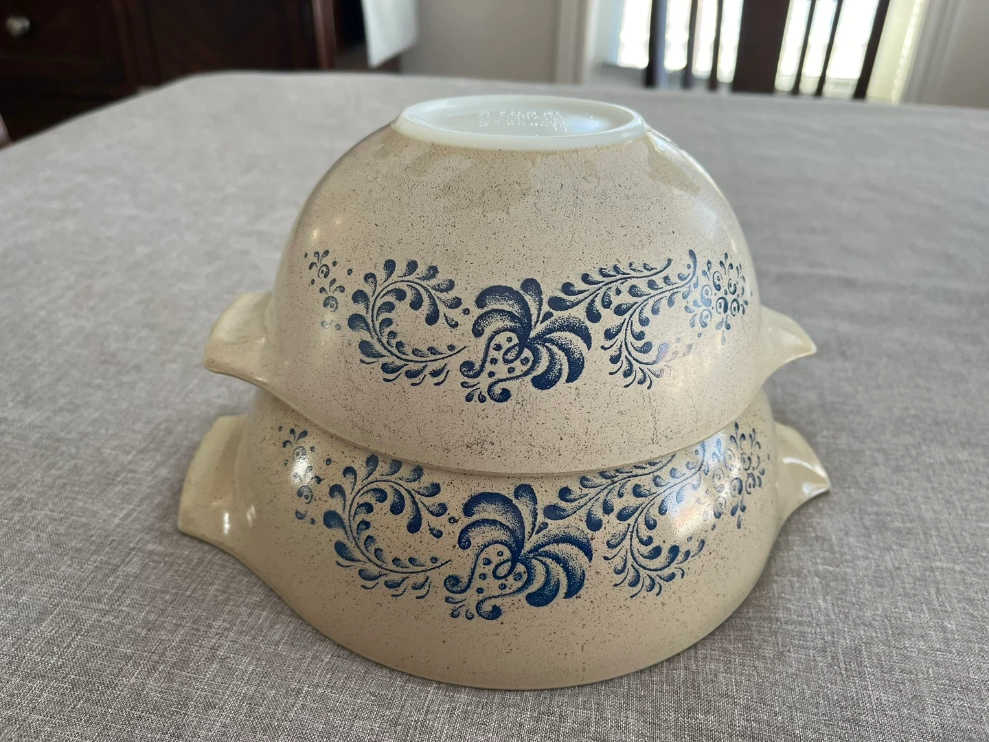 Set of 2 Vintage PYREX Homestead Cinderella Mixing bowls with Blue Floral pattern. These are beautiful, tempered glass mixing bowls with a speckled, almond beige Colour with stunning blue floral homestead pattern scrollwork detail on the sides. Sizes # 442 - 1.5 quart and # 443 - 2.5 quart. Can be used for baking and microwave.