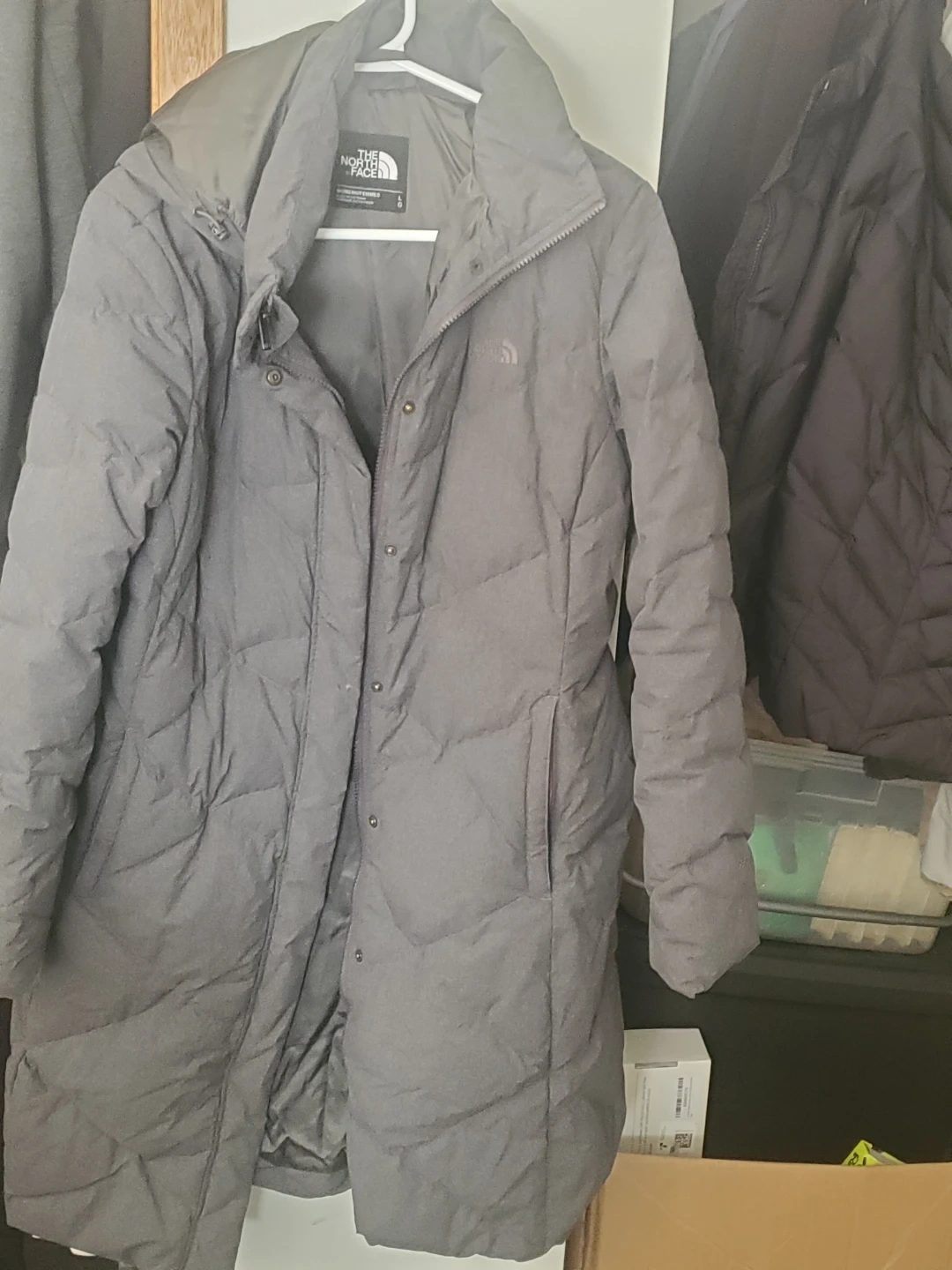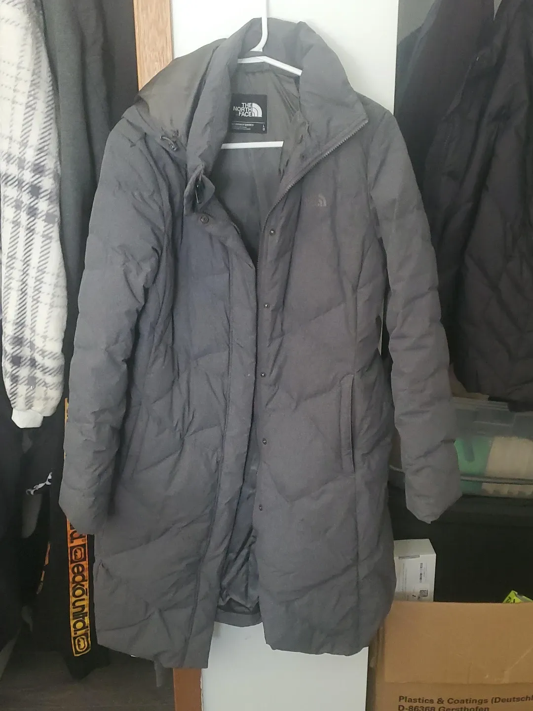 This is a pre-owned The North Face women's down parka in a medium grey colour. It features a full-zip front with snap closure. The coat has a comfortable, insulated fill.