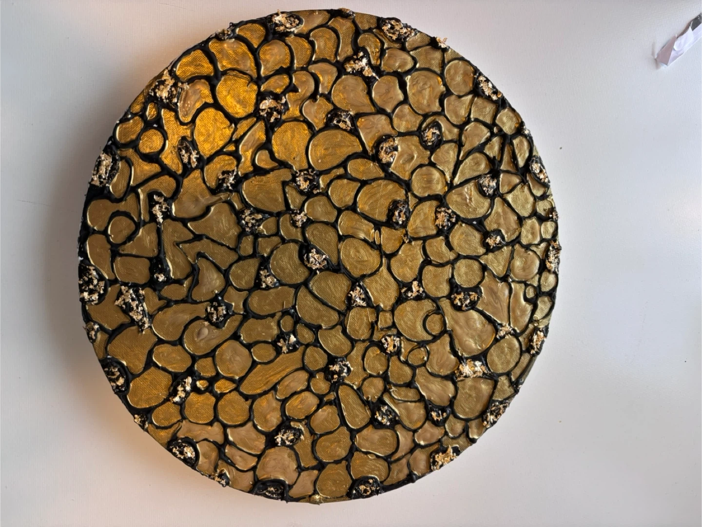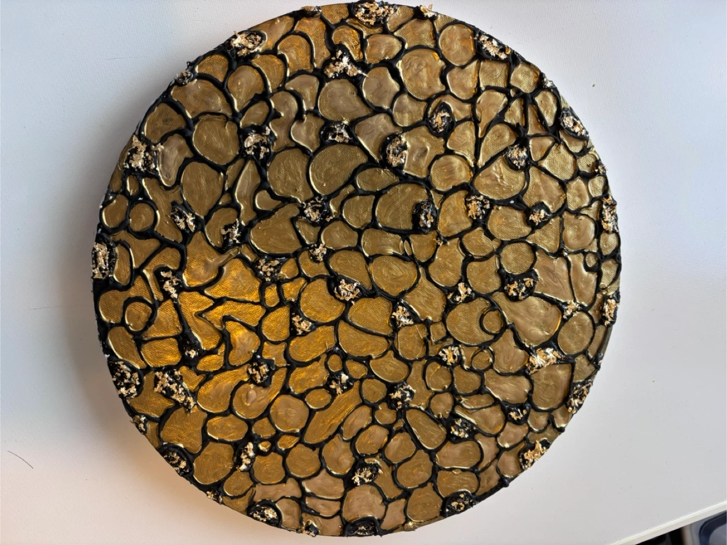 Decorative round wall art with a textured design. It features a pattern of raised gold-coloured shapes outlined in black, with speckled accents. This piece is suitable for adding a unique decorative touch to any room.