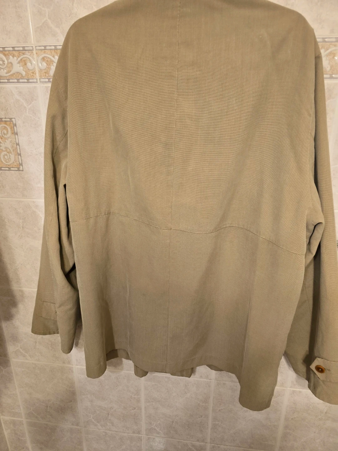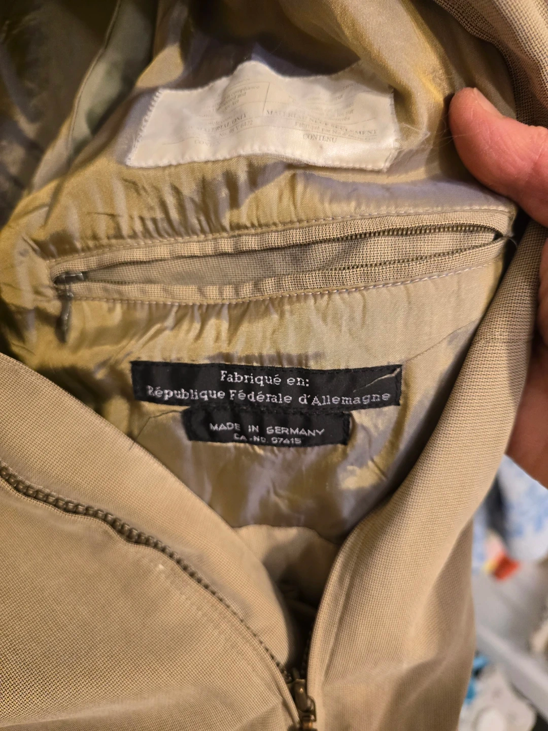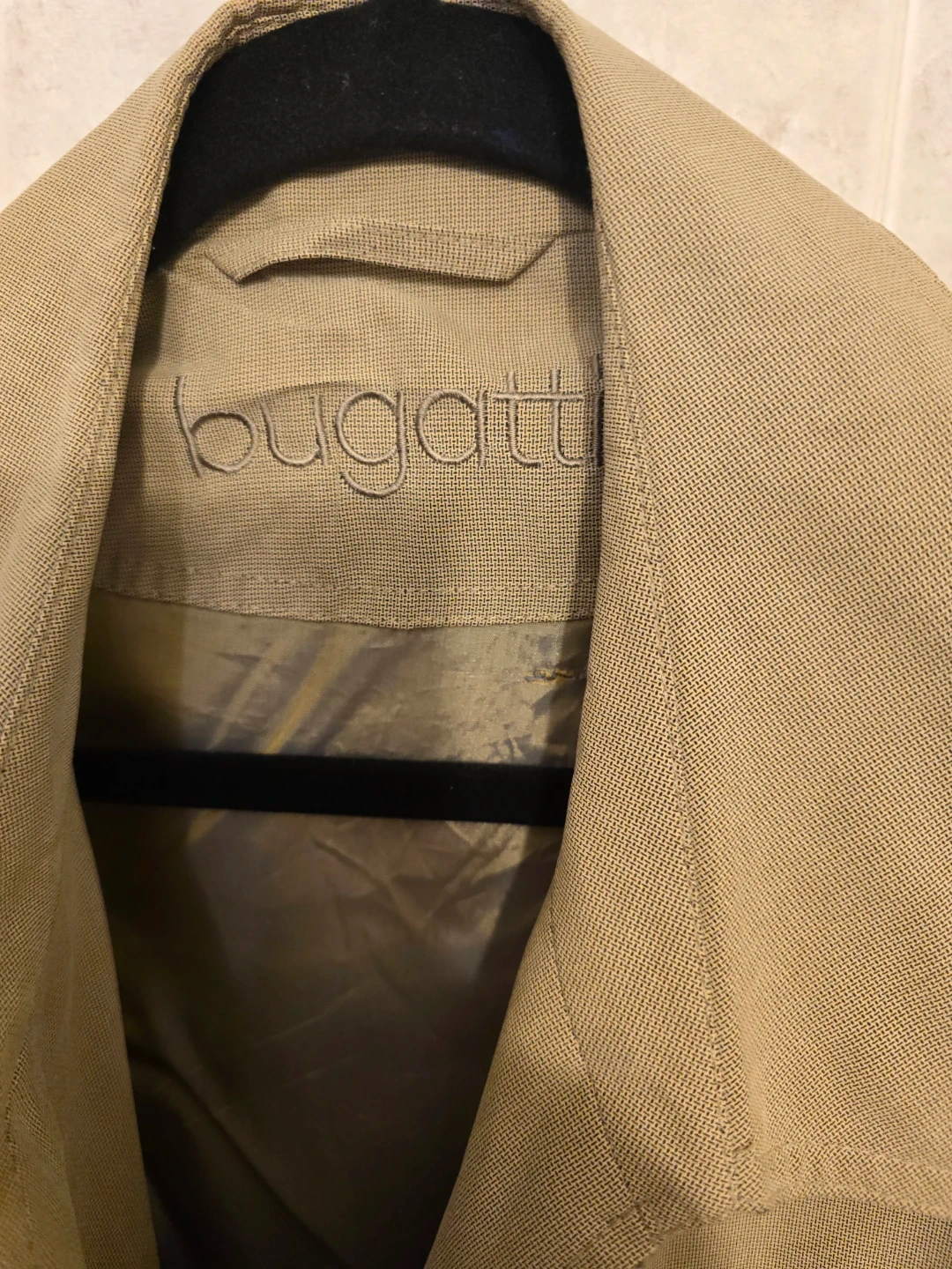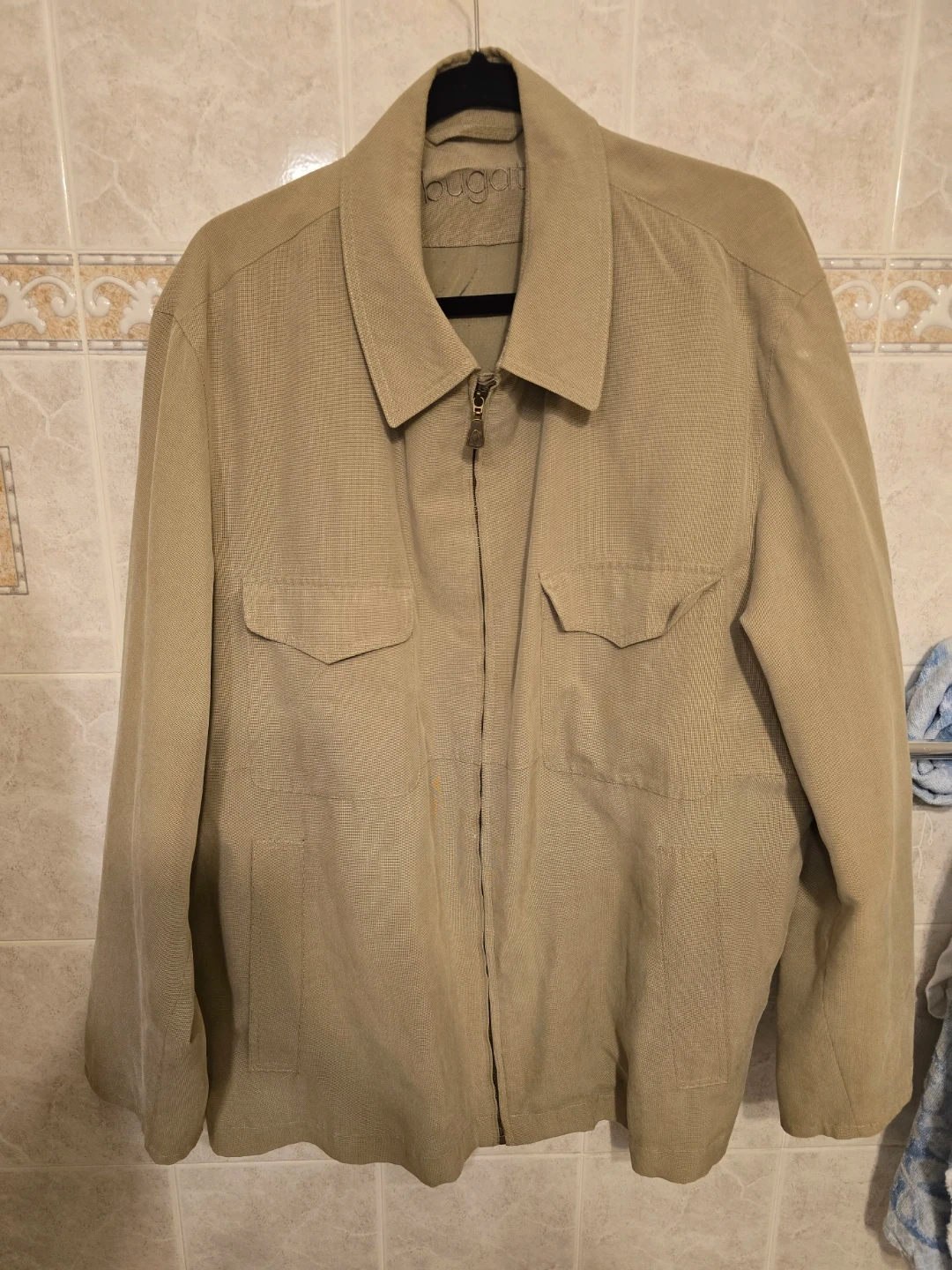 This is a tan jacket by Bugatti. It's made in Germany with a zip-up front. Two chest pockets are included.