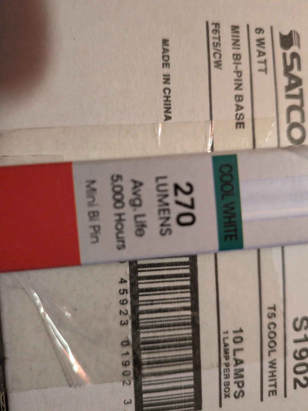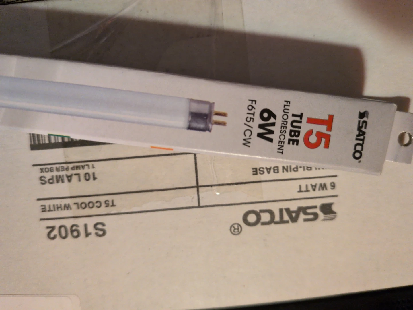 10 count - SATCO F6 T5/CW fluorescent tube light in cool white. It's a 6W bulb with a mini bi-pin base. Avg. life is 5,000 hours and it produces 270 lumens. This light would be useful for general illumination in workspaces or residential areas.