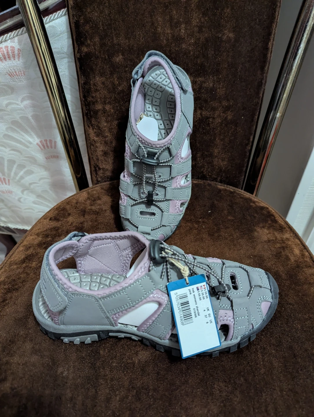 These grey and pink Trek sport sandals are designed for women. They feature a quick-lace system for easy adjustment. The soles offer good grip for outdoor activities. These would be great for summer hikes or water play!