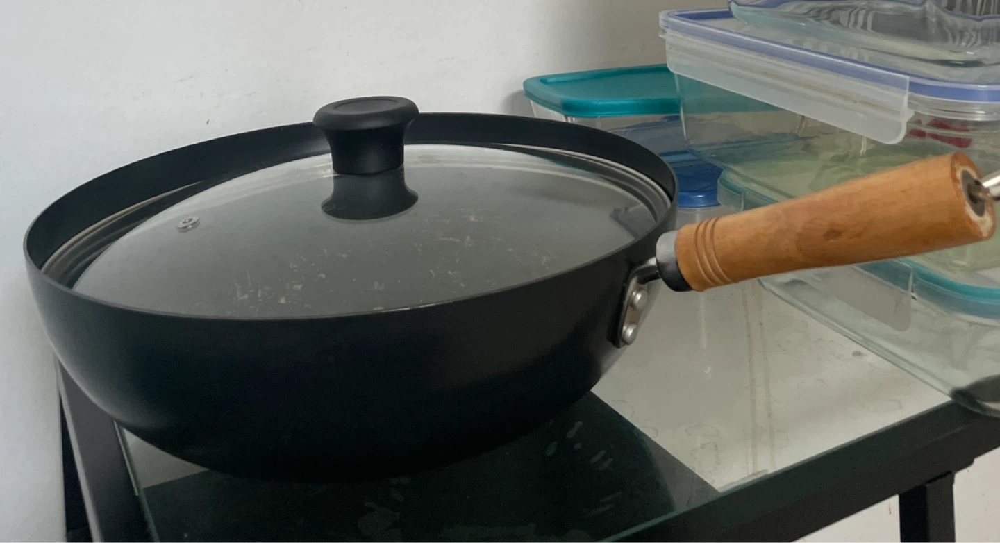 This is a black iron wok with a glass lid and a wooden handle. It shows signs of use inside and has several scratches that RUST since its iron, but it's still functional for cooking. It's suitable for stir-frying and other Asian-style dishes.