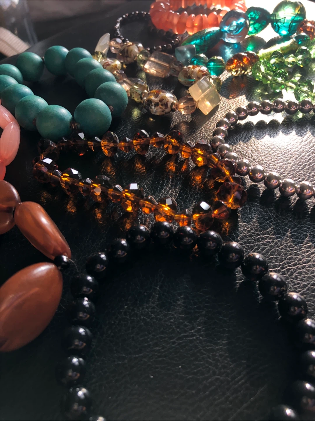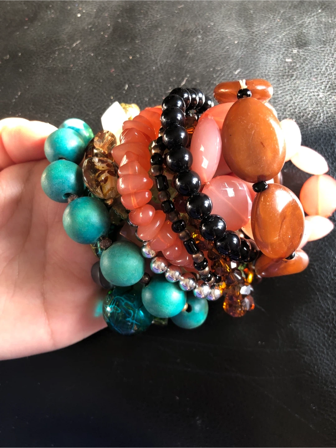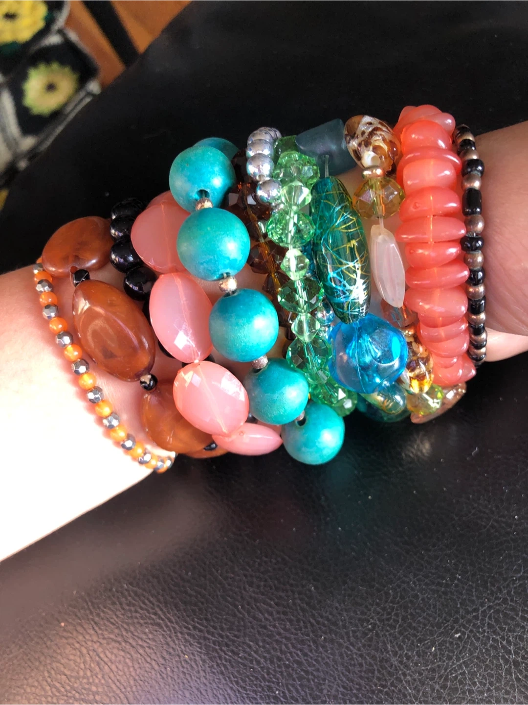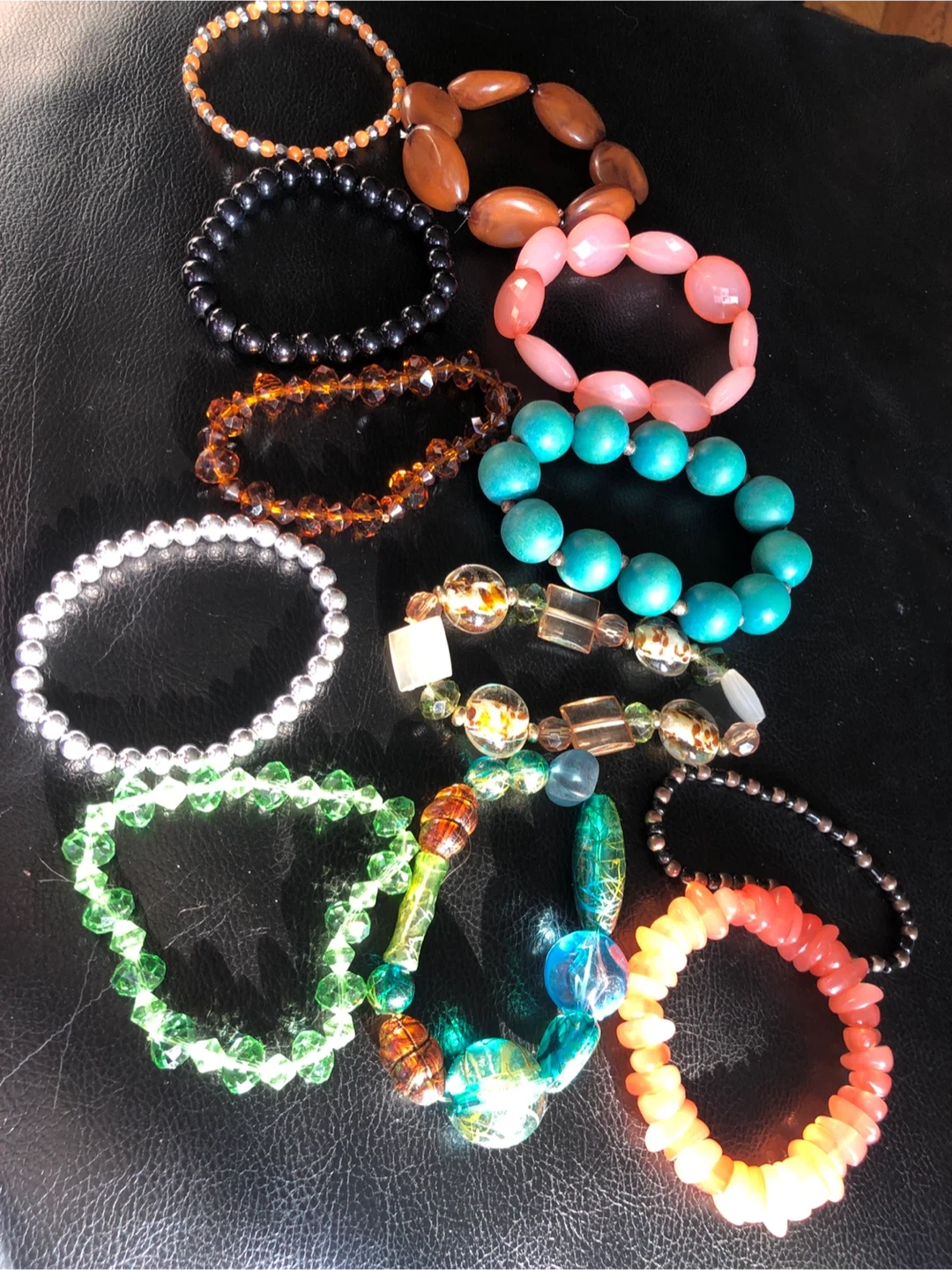 This lot includes assorted stretch bracelets with various beads and colors. Materials include glass, acrylic, and stone-like beads. Some bracelets have large statement beads, while others have smaller, delicate beads.