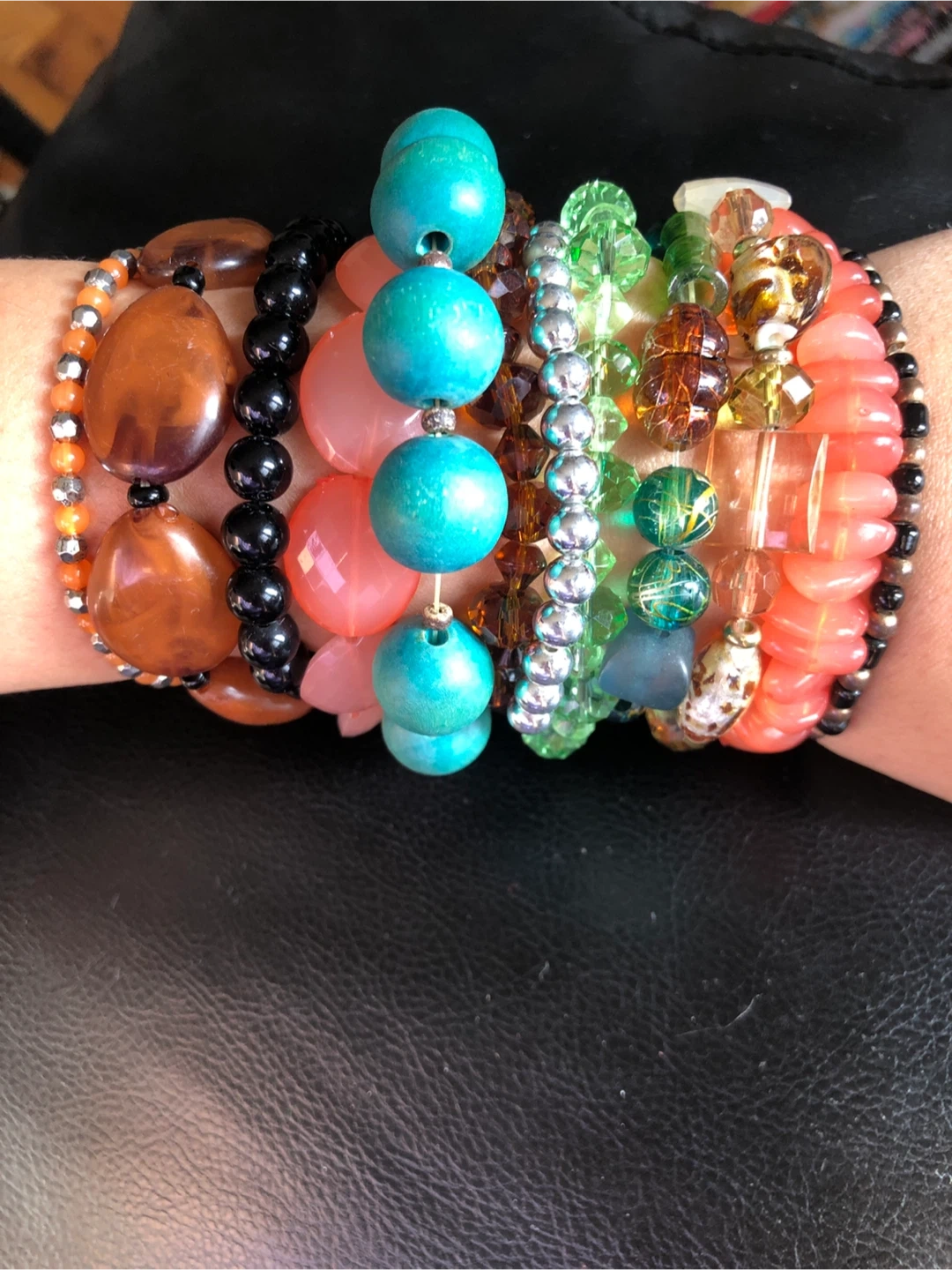 This lot includes assorted stretch bracelets with various beads and colors. Materials include glass, acrylic, and stone-like beads. Some bracelets have large statement beads, while others have smaller, delicate beads.