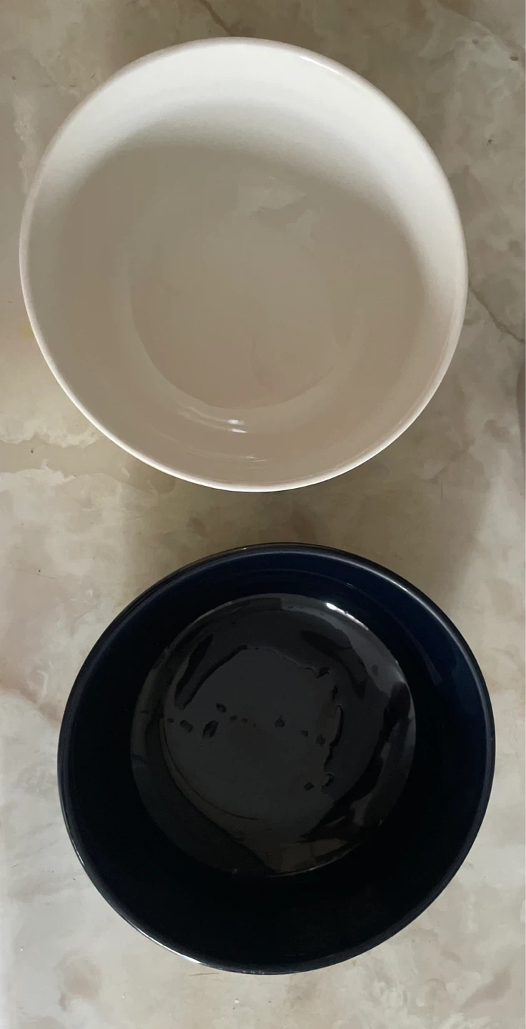 A set of two ceramic bowls, one pale yellow, and one deep blue. Dishwasher and microwave safe. These bowls are great for serving snacks or holding your morning cereal!